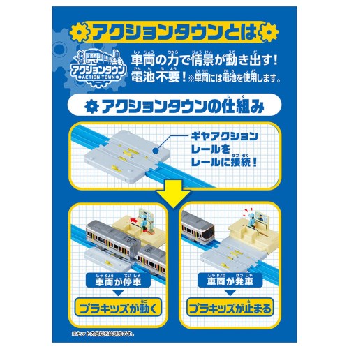 ■説明:車両の力で情景が動き出す!アクションタウンのプラキッズ改札駅が登場! 車両が駅に到着すると自動でプラキッズが動いて改札を通過! 付属のギヤアクションレールは1/2直線レールサイズでレイアウトも組みやすい!キミだけの動き出す街を作ろう! ギヤアクションレールはスイッチでAUTO、STOP、GOの3種類に切り替えができます。 AUTOでは車両が到着すると停車しプラキッズが自動で移動します。一定時間で車両は発車しプラキッズも止まります。 STOPでは停車したまま、プラキッズが移動をし続けます。(GOにすると発車し止まります。) GOでは停車せず車両は通過します。 ■プラキッズ1体(プラくん)付属 ■別売の「J-29 アクシ....