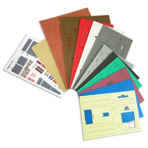 レーザーシートA〜K×11、屋根シート×1、印刷シート×1、プラ板×1、ベース×1、組み立て説明書×1