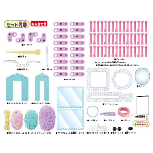 パーツA×4、パーツB×18、ピン×48、編み針×1、とじ針×1、縄編み針×1、毛糸×4、ボンボンメイク(小/大)×各1、目パーツ×2、鼻パーツ×1、ジョイントパーツ(3種)×各1、リボン×1、わた×1、クリアポシェット用透明パーツ×2、ヘアゴム×1、..