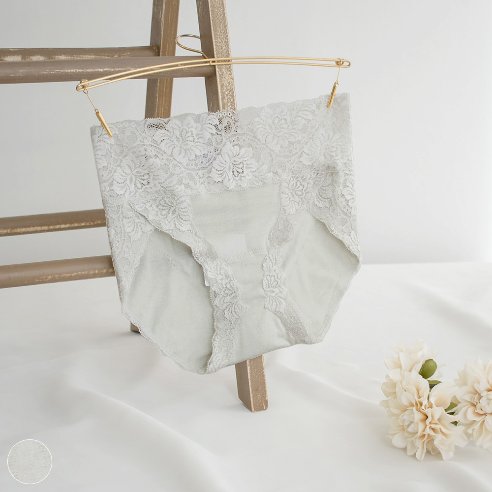 ウエストと足繰りはゴムを使用せず幅広レースを使用して柔らかく締め付けのない履き心地に。程よいフィット感がありつつも食い込みにくく響きにくい。さらに足繰りレースの内側はシルク生地を裏打ちしていますので、しっとりソフトなシルクがお肌にそっと優しく寄り添ってくれる、癒しの肌触りです。
