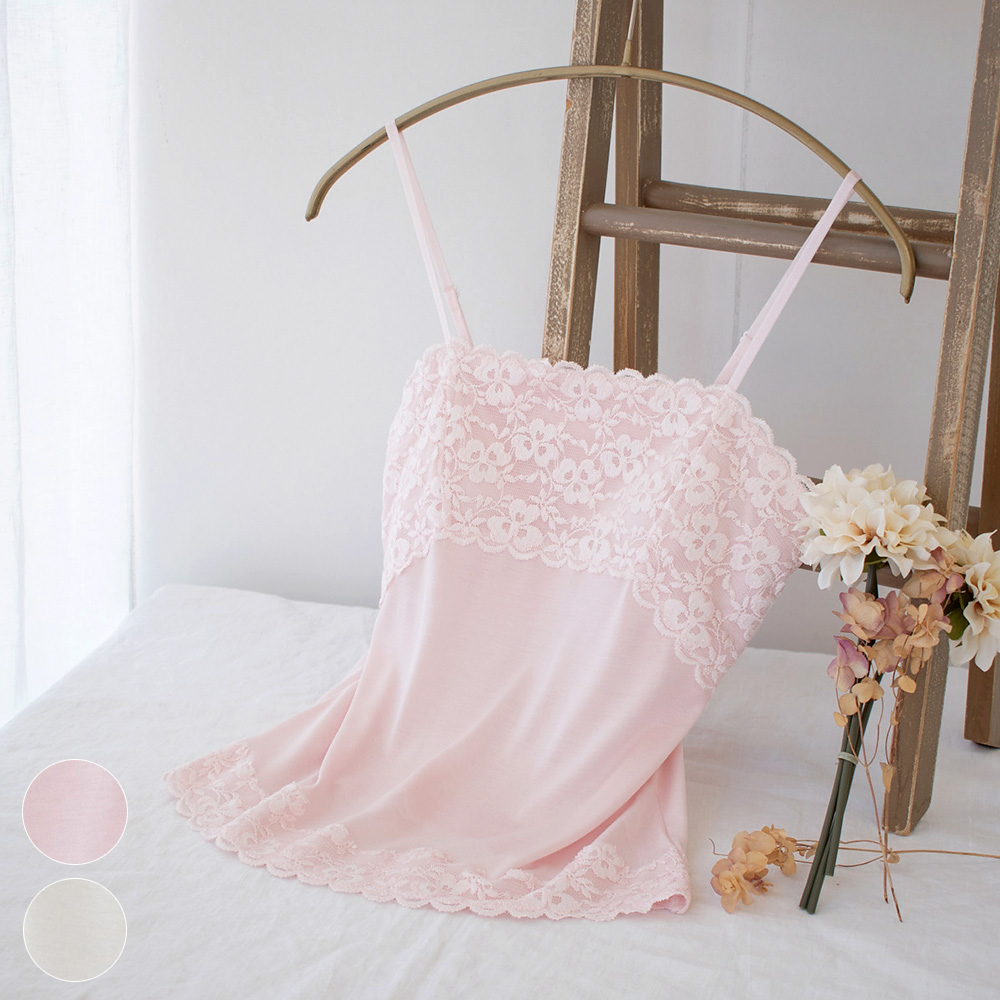 バスト部分は程よいフィット感がありつつも楽に着られる絶妙なカットライン。胸元と裾にレースを施し、エレガントに仕上げたブラキャミソールです。