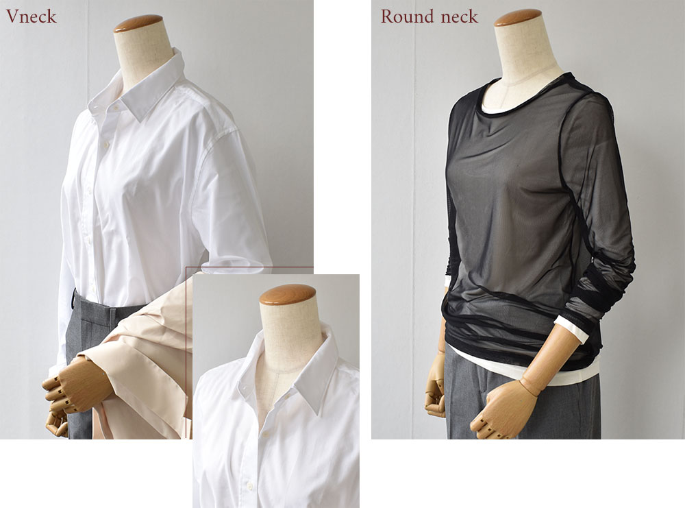 背中側に抜け感のあるニットやシャツ・トップスに合わせるなら、深V側を背中にもってくるとすっきりとお召し頂けます。
