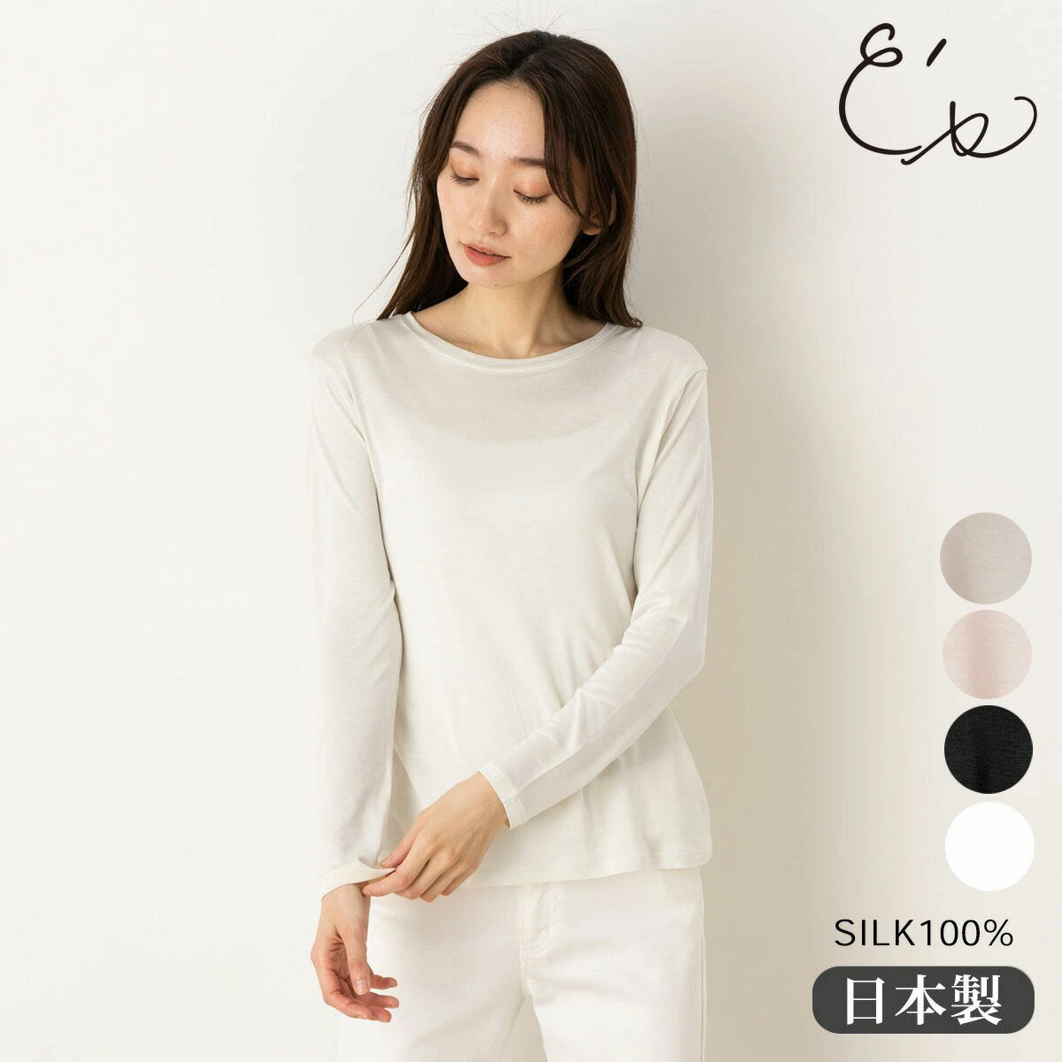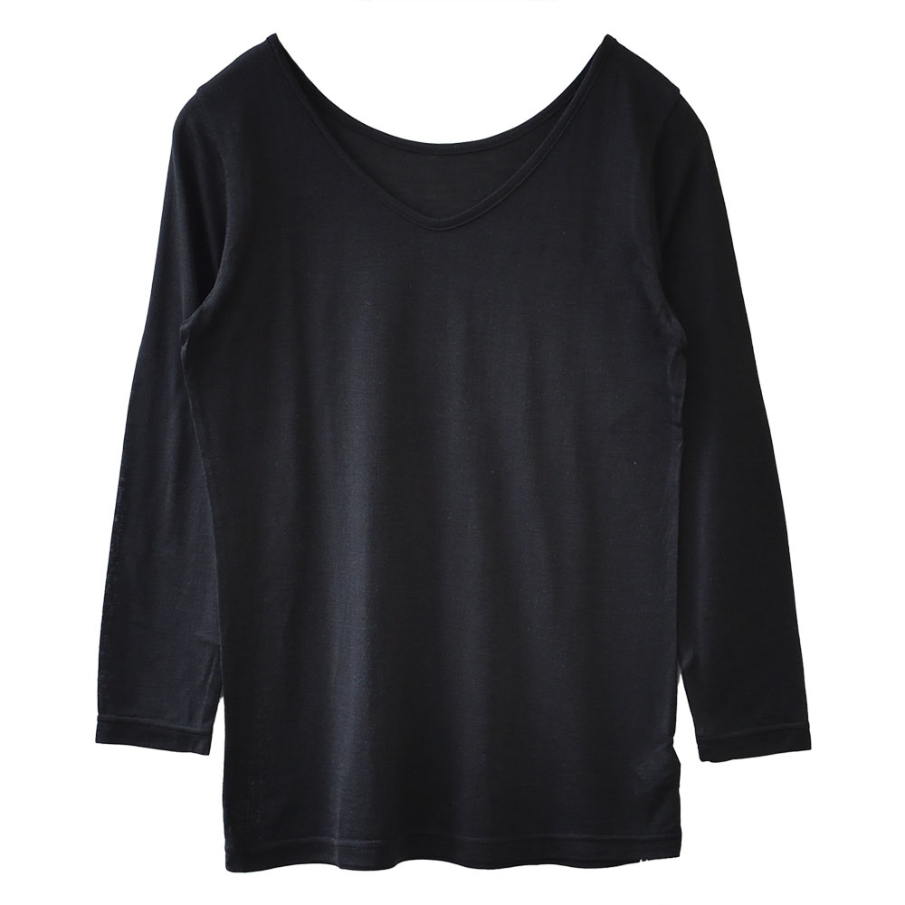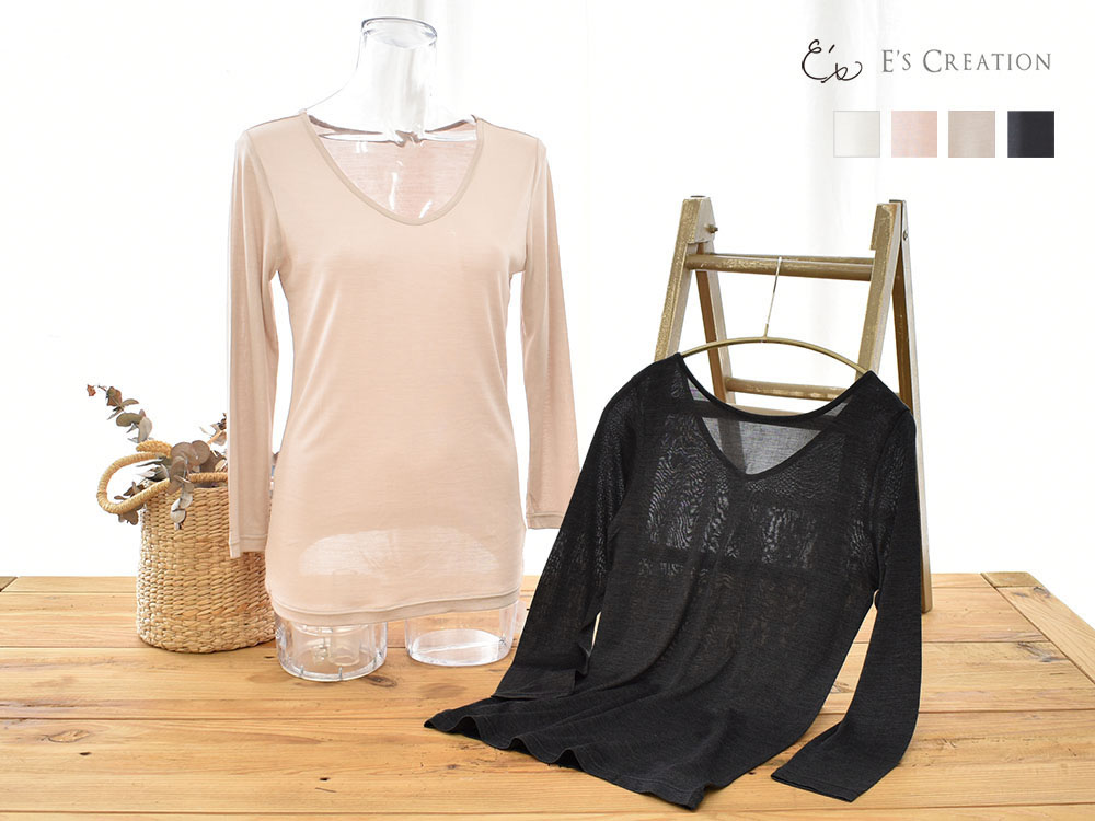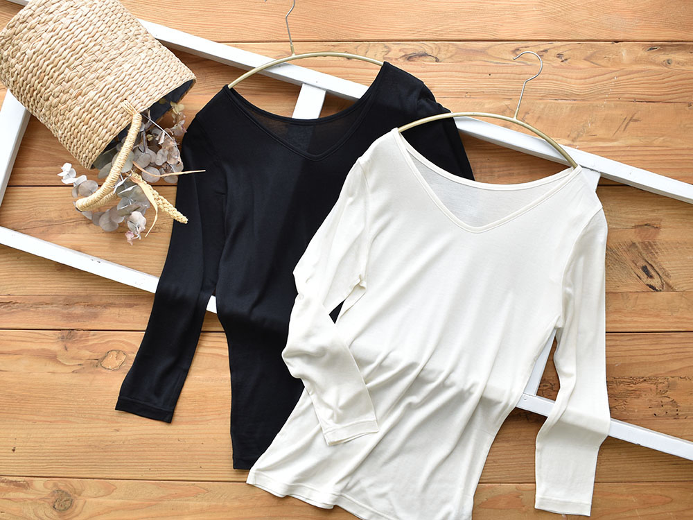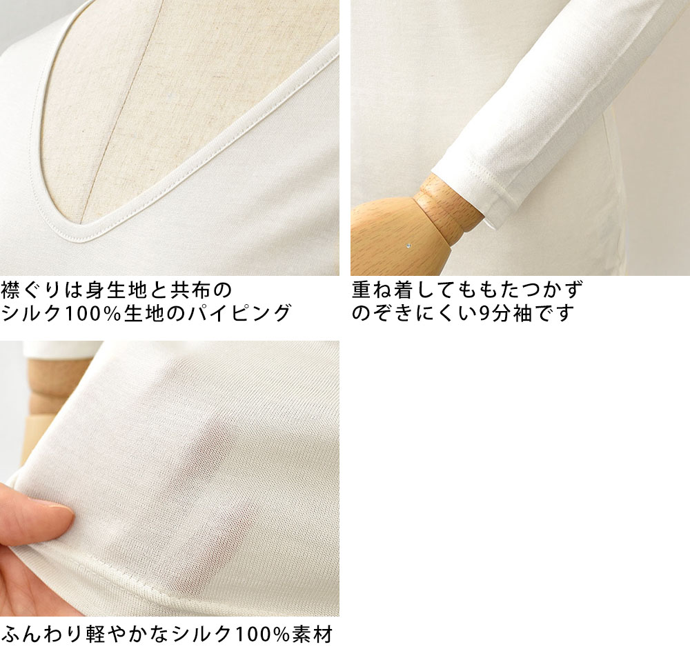 柔らかくふんわりとしたシルク100%生地で、やさしい肌触りに癒やされます。薄手でお肌に馴染みやすく、まるで第二の皮膚のように自然な着心地。 インナーとして使いやすい厚みです。落ち着いた光沢感。