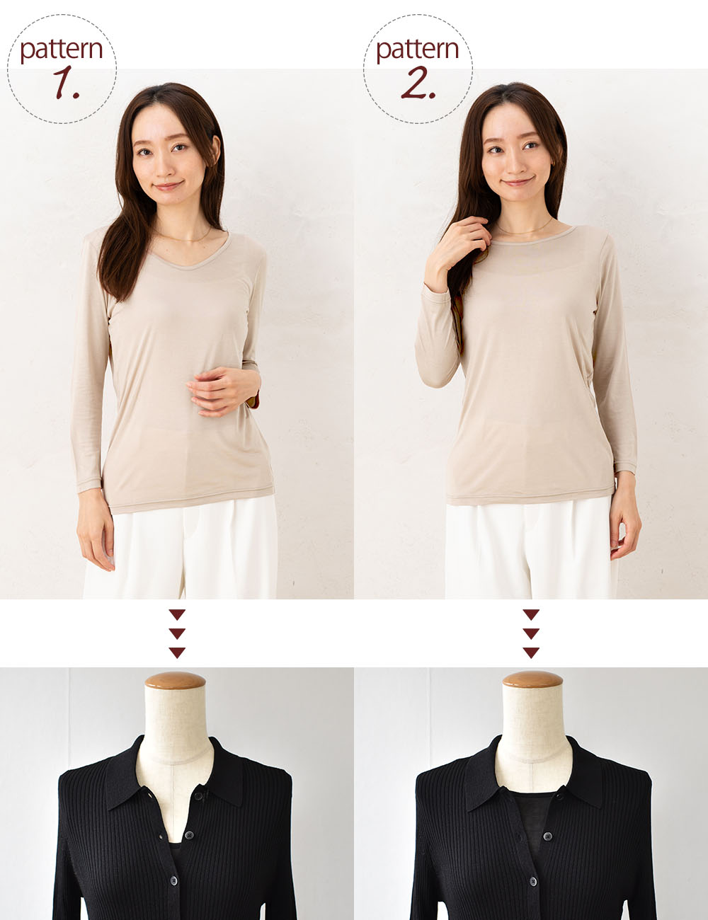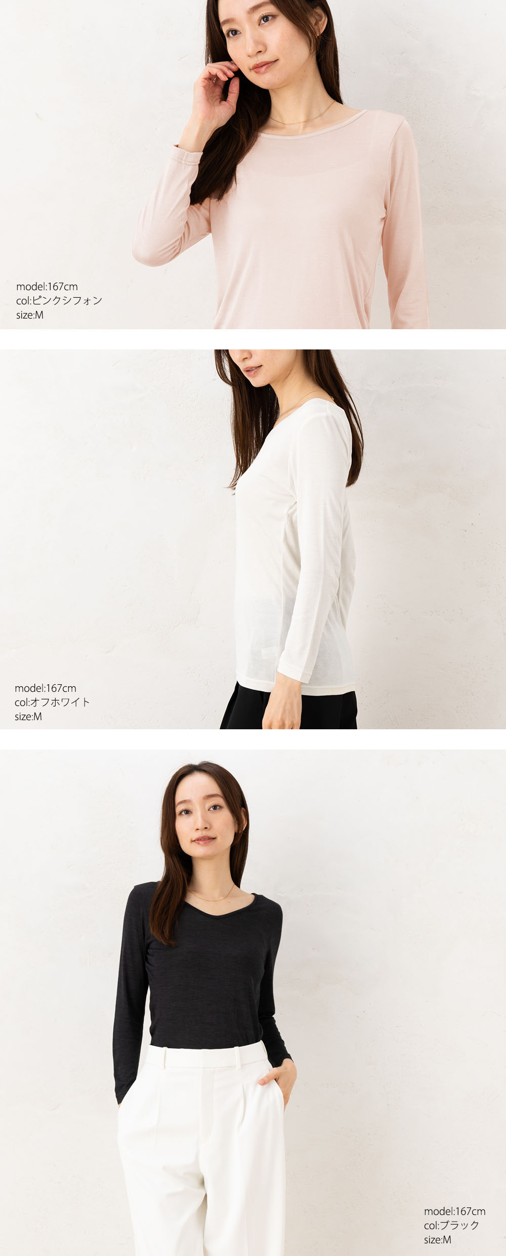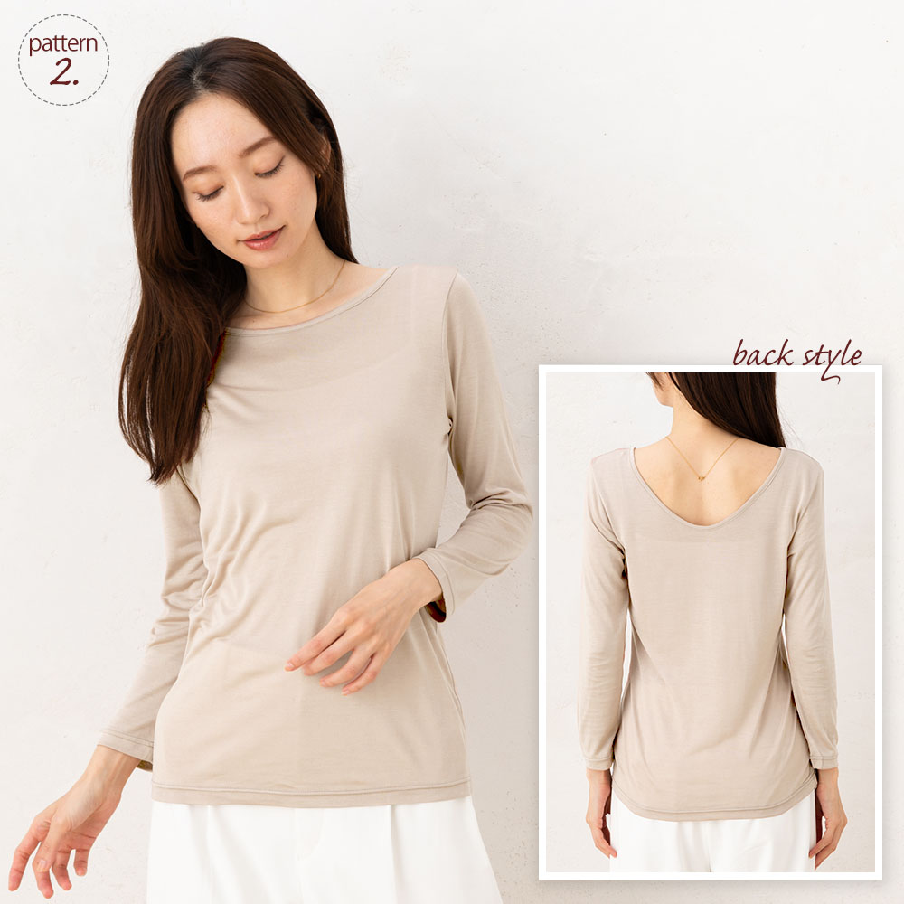 薄手の生地なので重ね着してもかさばりにくく、襟ぐりの空きを前後で変えることでどんなお洋服にも合わせやすい。袖の長さを少し短くしたことでお洋服から覗きにくく、オシャレをうんと楽しめます。