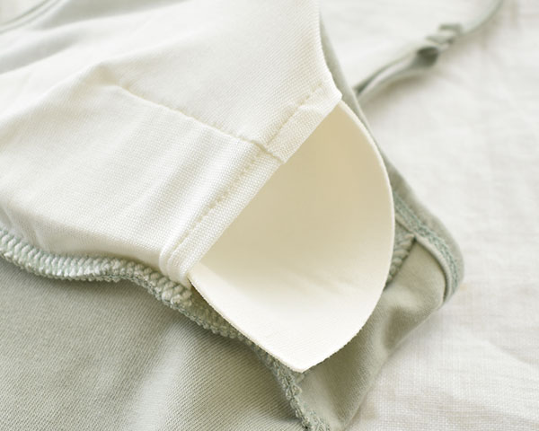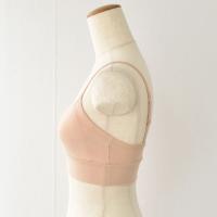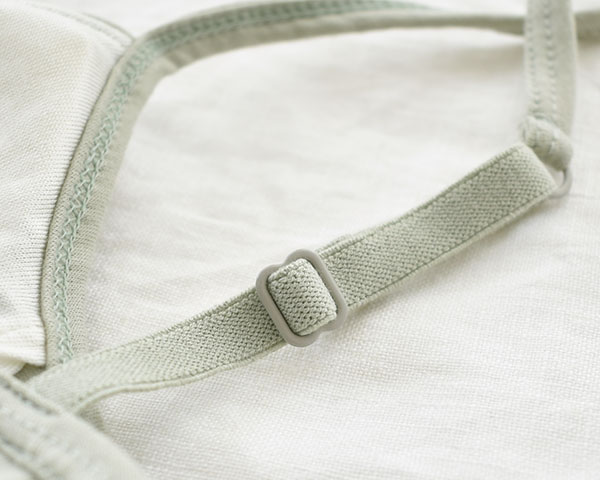 身生地は少しハリのあるソフトなコットン生地。伸縮性があり伸び良い生地なので、ゴムを使用しなくても程よいフィット感。バスト部分はダーツをサイドに寄せたことで、アウターに響きにくくしました。窮屈感のないやさしい付け心地とカップ裏シルクの滑らかな肌触りに癒やされる一枚。