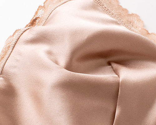 カップ裏はすべすべなめらかなシルクサテン生地を使用。 吸・放湿性に優れたシルクは汗をかいてもべたつきにくく快適。 ショーツはヒップ側が総レース仕立てでラインが響きにくく、 また、足繰りにゴムを使用していないため嫌な締め付けなく快適にお召し頂けます。