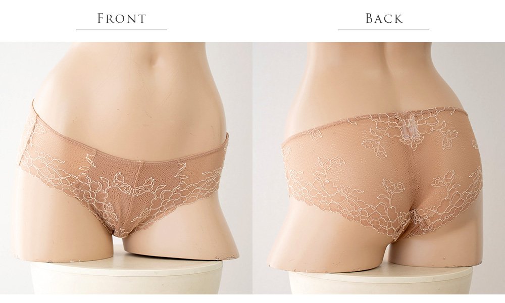レースで仕立てたショーツ。フロントからマチにかけて肌側にシルクサテンを裏打ちして、すべすべの肌触りに。ヒップ側は総レース仕立て、ストレッチが効いているので伸縮性があり、締め付け感がなくやわらかなフィット感です。裾までレースなのでアウターにも響きにくいです。