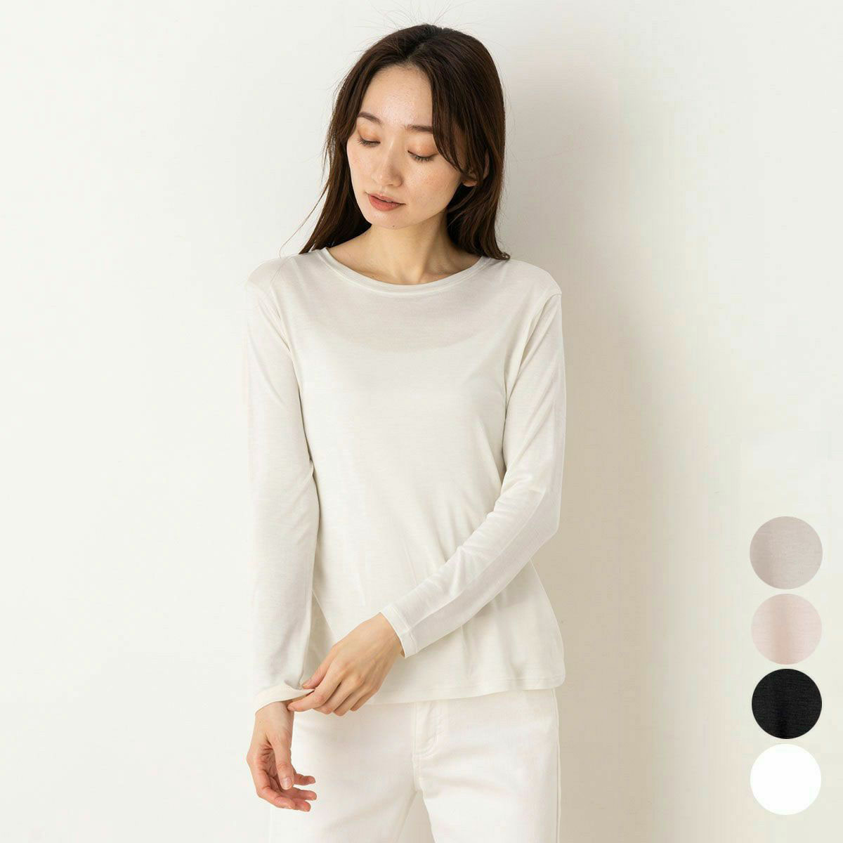 マットな艶感でカジュアルにもキレイめにも着こなせるインナーです。ジャケットインやシャツのイン、ニットにも。程よいシアー感で、インナーにブラトップを重ねるのがおすすめです。