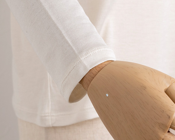 柔らかくふんわりとしたシルク100%生地で、やさしい肌触りに癒やされます。薄手でお肌に馴染みやすく、まるで第二の皮膚のように自然な着心地。 インナーとして使いやすい厚みです。落ち着いた光沢感。