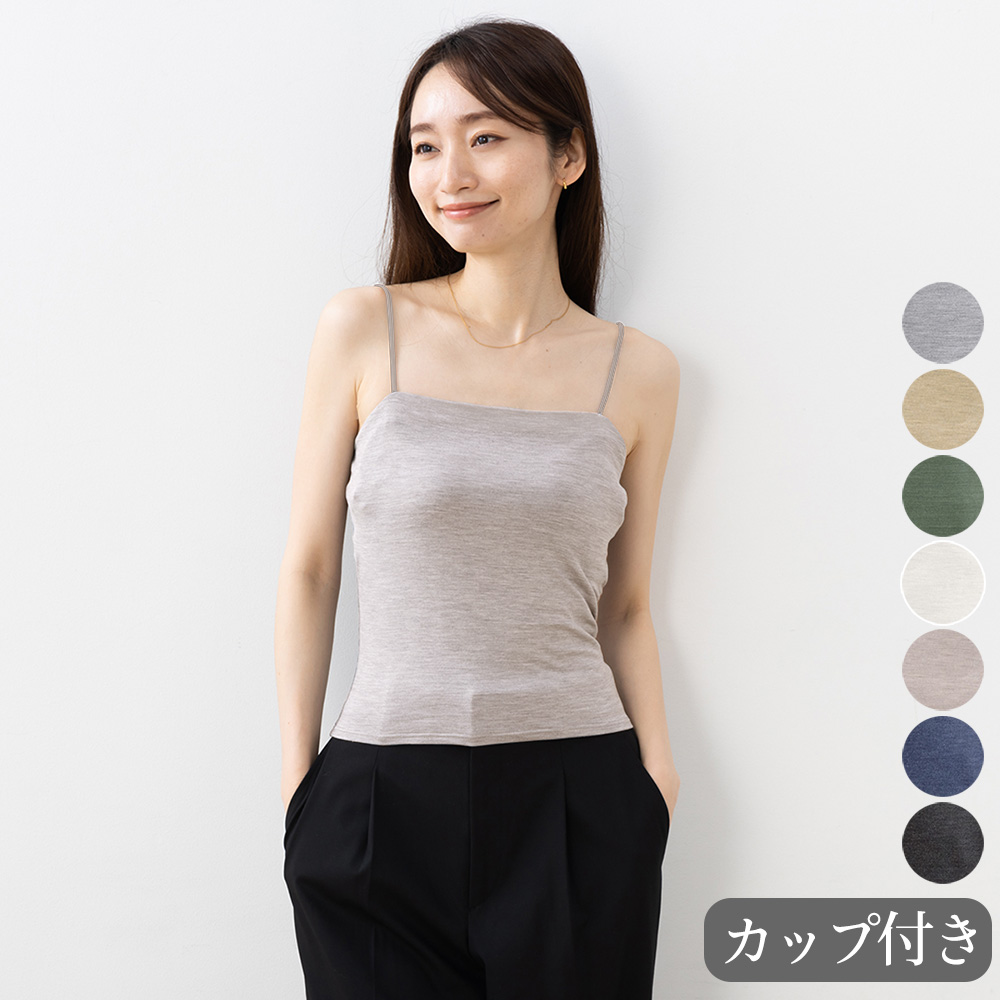 薄手の割に透け感が少なく、伸縮性に優れ、身体に動きになじむ心地よいフィット感のシルク カップ付き インナー。フラットなネックラインで着回しやすく、着丈も短めにして表にも響きにくいスマートな印象に。シンプルなデザインですから、デイリーインナーとしてはもちろん、ブラの要らないインナーキャミソールとしてレイヤードコーデも楽しめます。