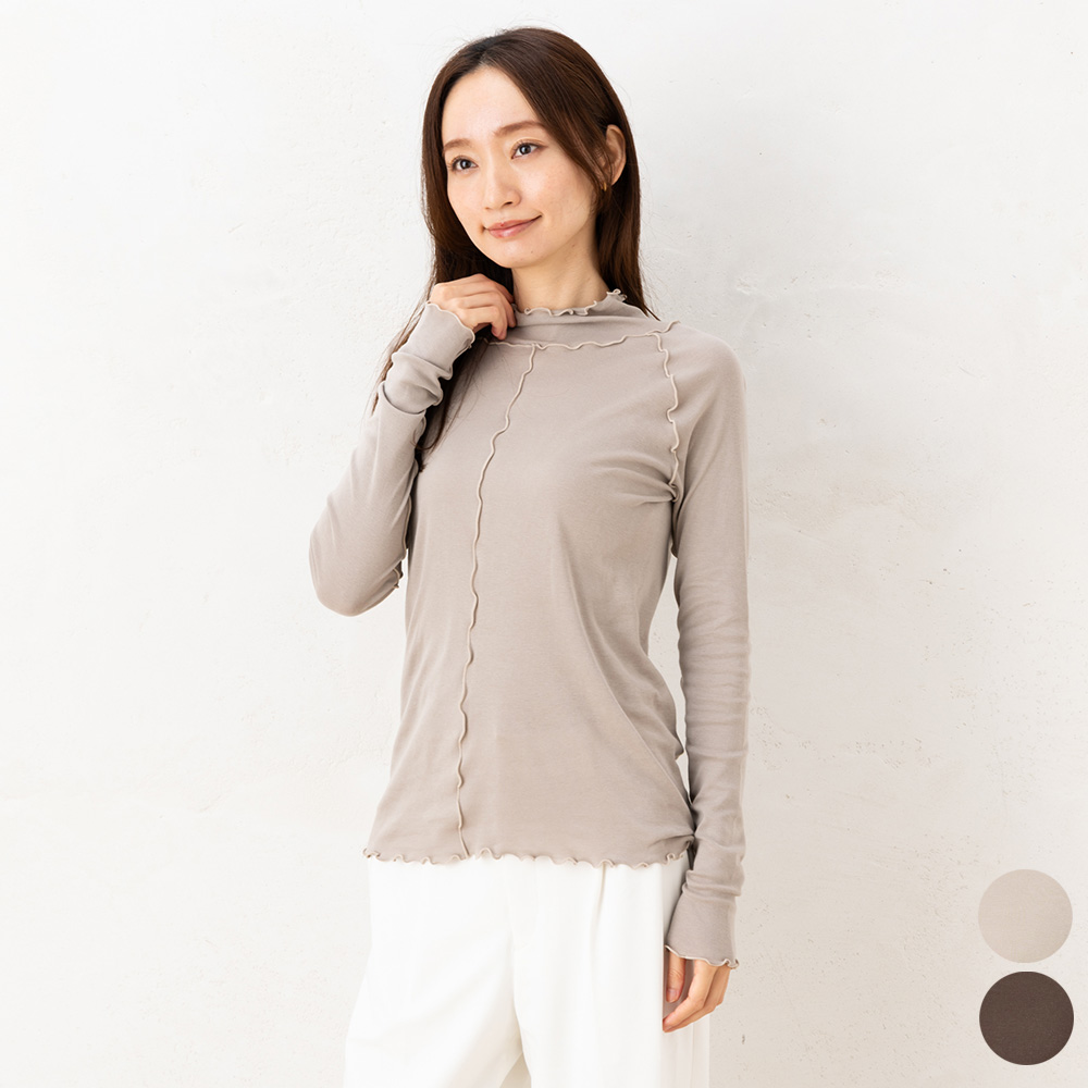 ほどよいフィット感のある長袖 インナー。素肌に優しくなじみます。各所縫い目を表側に返して、肌側はするんとなめらか、お肌に優しい着心地です。ハイネック部分はゆとりあるお作りにして、締め付け感なく首回りをカバー。ちくちくニットの刺激から優しく守ってくれます。