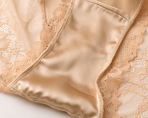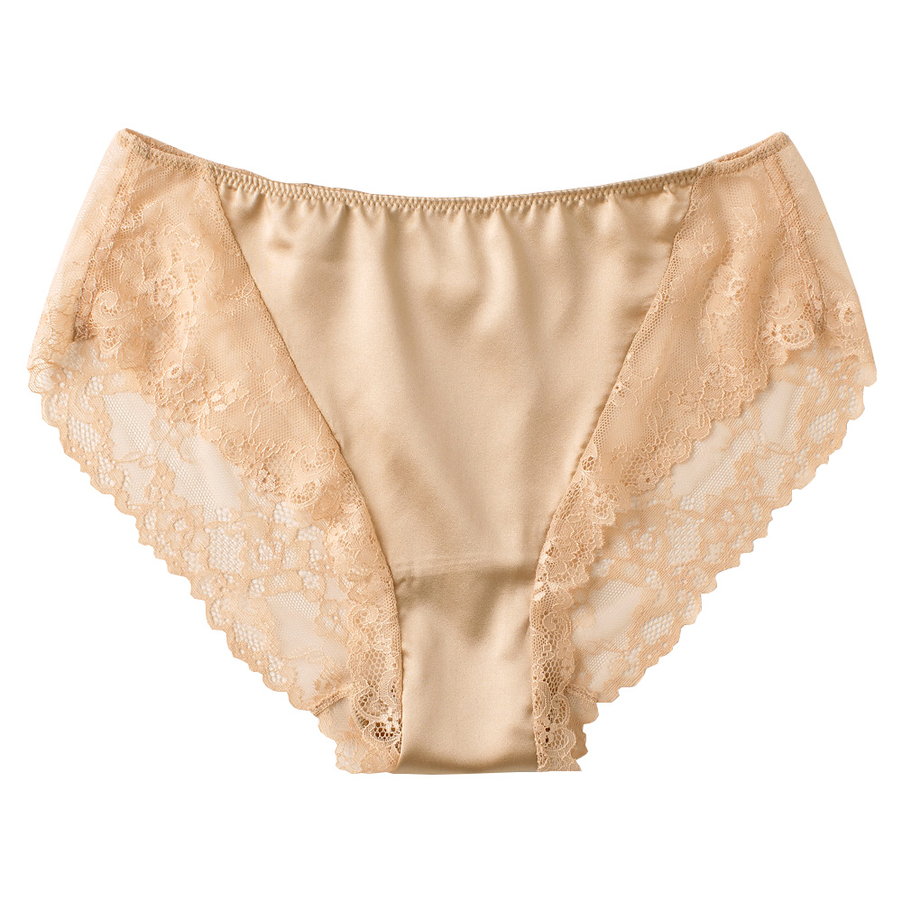 ヒップ側は中央がシルクサテン、サイドからヒップにかけてレース仕立てで透け感があり、レース本来の美しさを堪能できます。アウターにも響きにくく、タイトなパンツスタイルもきれいに着こなせます。
