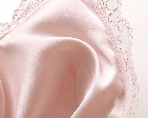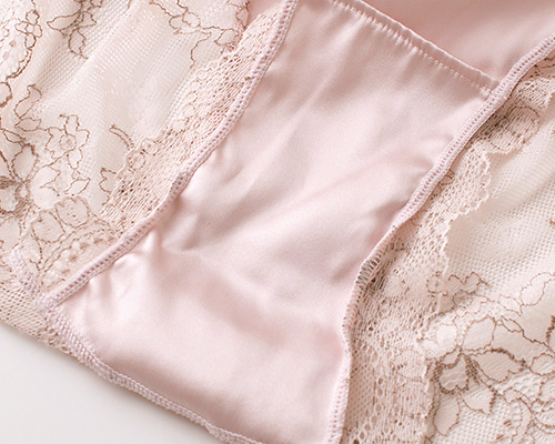 カップ裏はすべすべなめらかなシルクサテン生地を使用。 吸・放湿性に優れたシルクは汗をかいてもべたつきにくく快適。 ショーツはサイドからバックにかけてレース仕立てでラインが響きにくく、 また、足繰りにゴムを使用していないため嫌な締め付けなく快適にお召し頂けます。