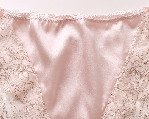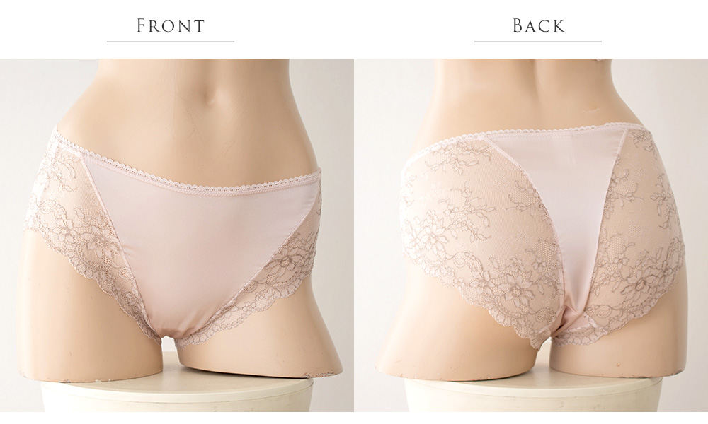 フロントはすべすべのシルクサテンで仕立て、ほんのり艶感が美しい。シルク特有のしっとりした肌触りと艶感を持つシルクサテンは、汗をかいてもべたつきにくく、快適に過ごせます。ヒップ側は中央がシルクサテン、サイドからヒップにかけてレース仕立てで透け感があり、レース本来の美しさを堪能できます。アウターにも響きにくく、タイトなパンツスタイルもきれいに着こなせます。