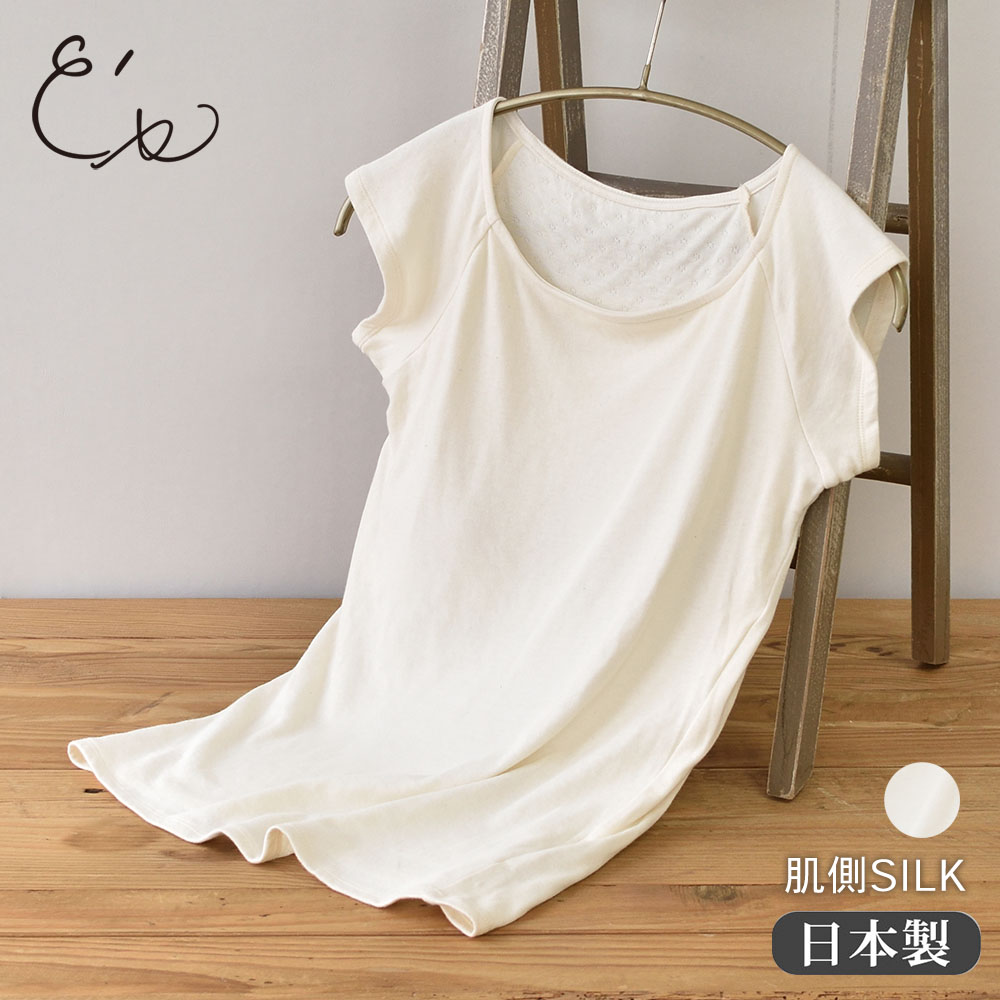 なめらかな肌触りのシルクと、ふんわり軽やかなコットンを重ねた贅沢素材。ダブルガーゼのように薄手の2枚の生地を点で結合(接結)させているから、ふんわりと空気を含んで柔らかく、保温性もあり、薄手なのにあったかい。肌側はシルク100%。吸放湿性に優れた絹だから、汗やムレを吸い取り発散、不快感を軽減します。