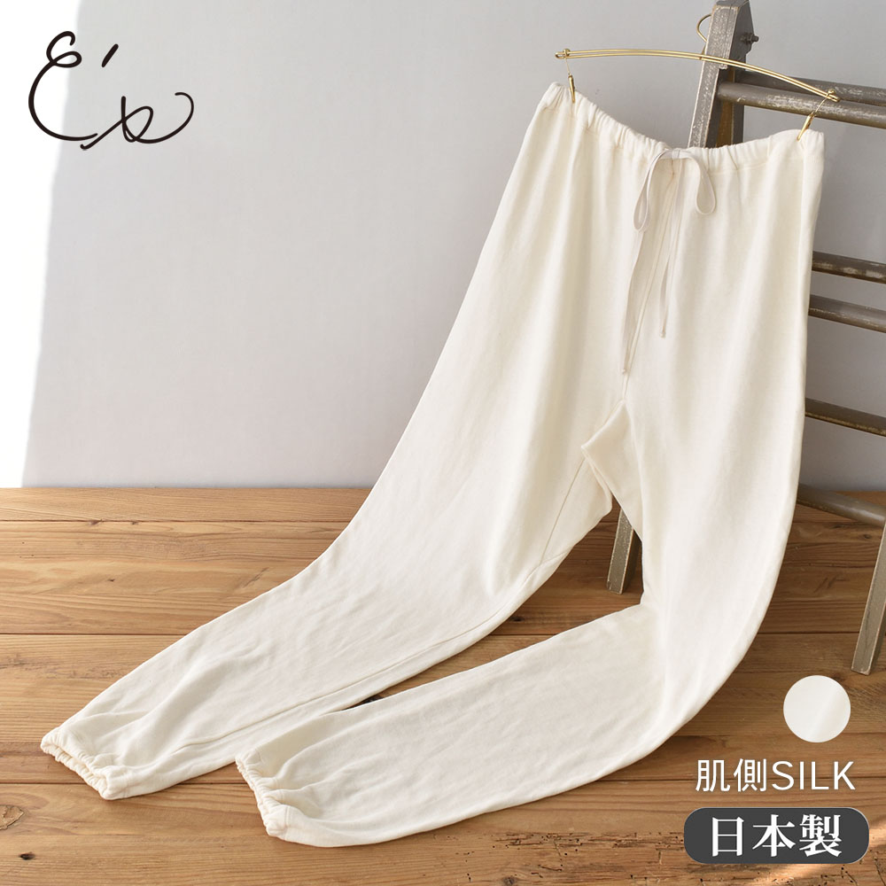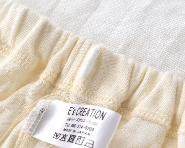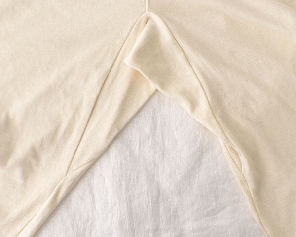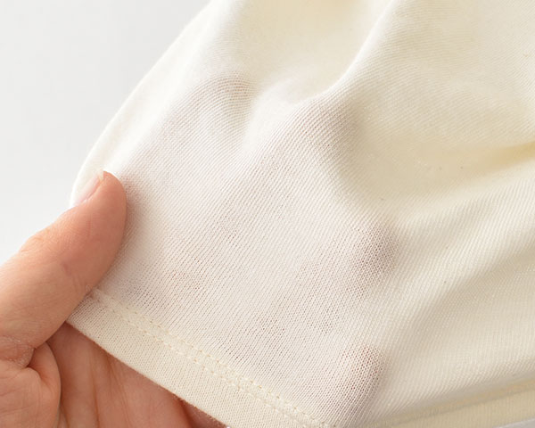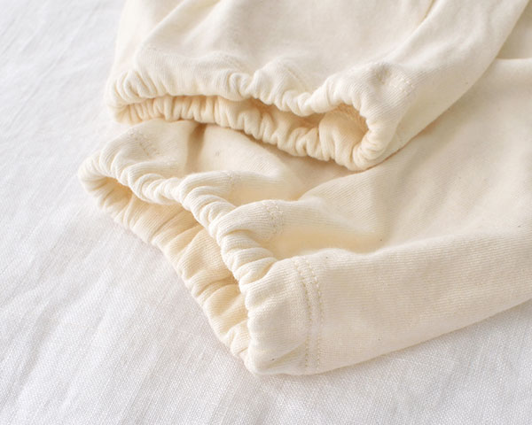 肌側のシルク生地と外側のコットン生地との間に空気をため込んだ生地は、まるで赤ちゃんの肌着のようにふんわりと柔らかく心地の良い肌触り。脚を通すとその気持ちよさに思わず笑みがこぼれそう。保温性もあるので、薄手なのにあたたかく、肌寒い季節のパジャマインナーとしてパジャマの下に一枚重ねるだけで心地よい眠りへと誘ってくれます。