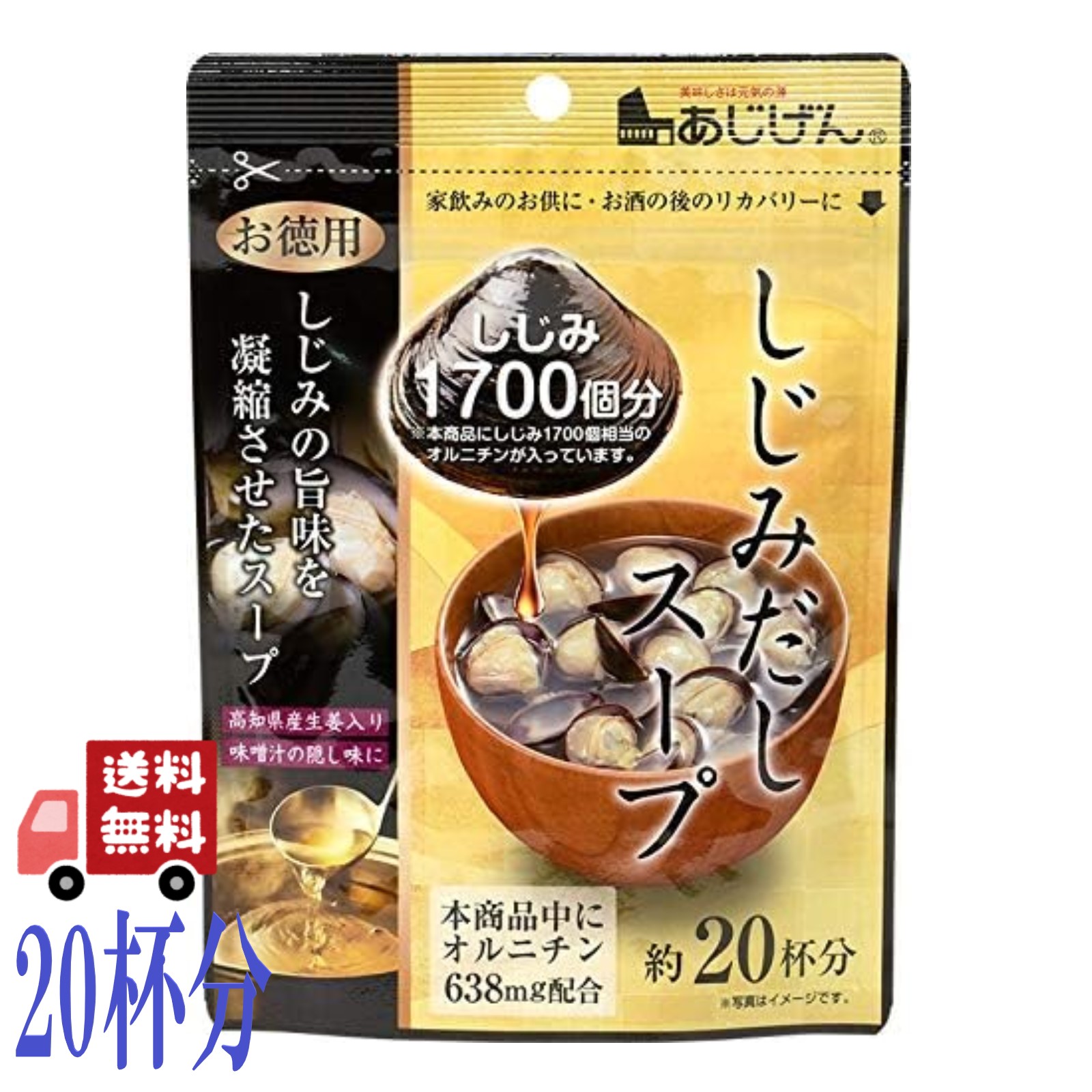しじみのだしがきいた、うま味たっぷりのしじみだしスープです。アクセントに高知県産生姜をきかせました。1袋にしじみ1700個分相当のオルニチン 638mg配合で、家飲みのお供やお酒の後のリカバリーにもぴったりです。