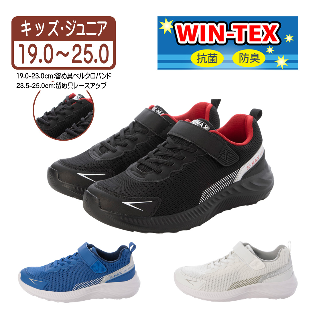 ※19.0-23.0cmはベルクロバンド、23.5-25.0cmはレースアップと、サイズにより留め具の仕様が異なります。
