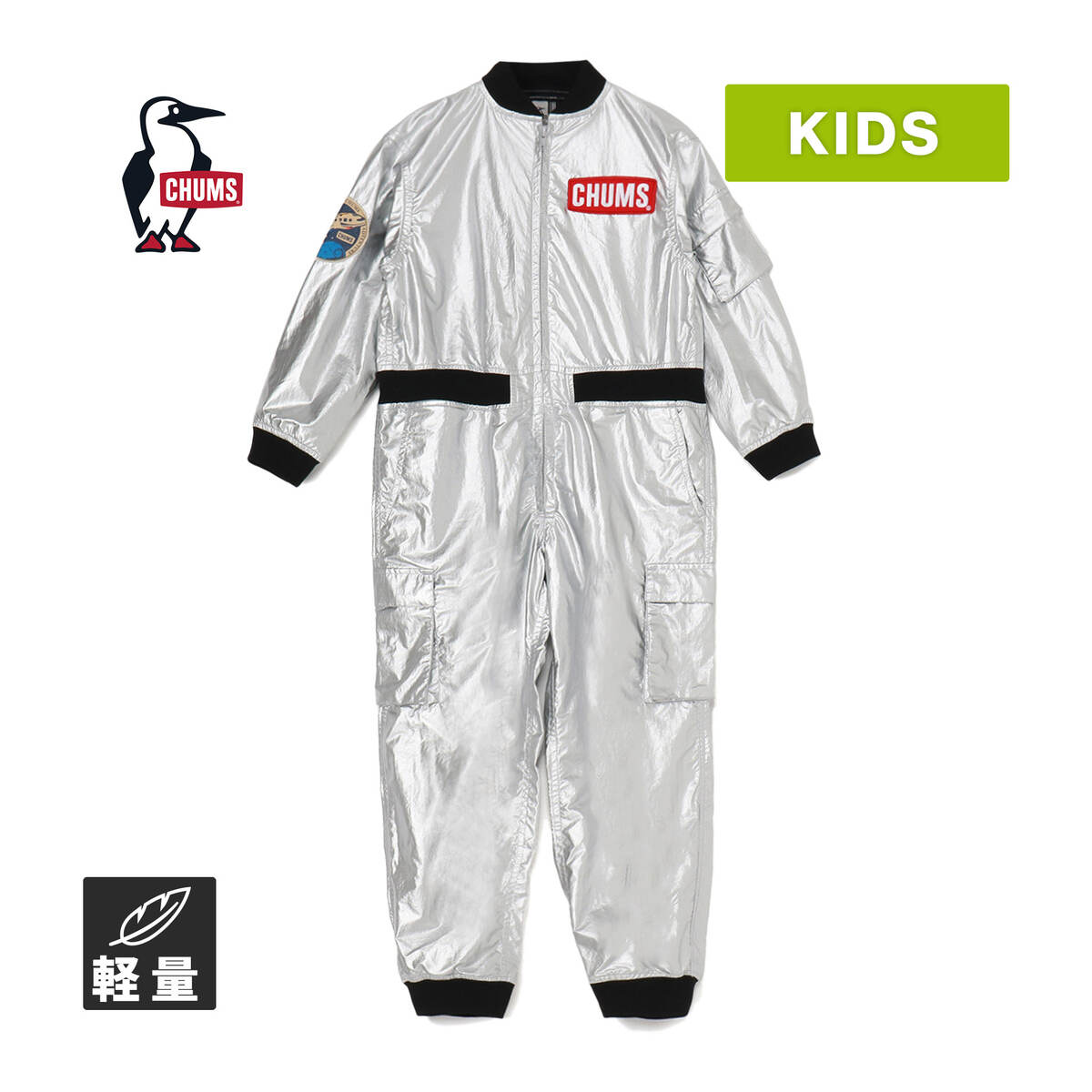 軽い素材ですのでラフに来ていただけます、上だけを腰まで下ろして袖を腰に巻いて着たり、1枚で目立てるスペーススーツです。