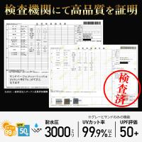 検査機関にて試験を行い、耐水圧3000ミリ、UVカット率99.9%以上、UPF50+の高品質を証明!安心してご使用いただけます。