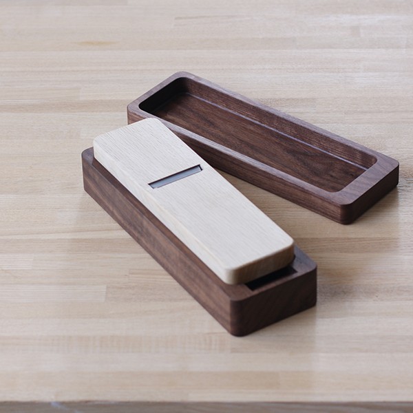 箱は美しい高級木材のウォルナット。無垢材を削り出して作った箱は継ぎ目がなくツルリとしていて、食卓においても違和感のないコンパクトで和モダンな形状。