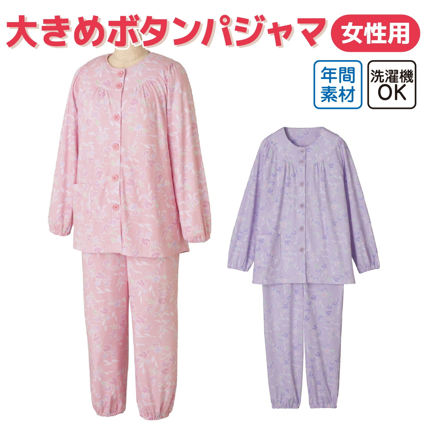 婦人用 介護パジャマ【大きめボタン】 長袖 ラグラン袖 手口ゴム入り 高齢者 シニア 入院 入所 S M L LL