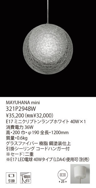 ●型番:321P2948W●品名:MAYUHANA mini●メーカー:ヤマギワ●ブランド:YAMAGIWA●デザイナー:伊東 豊雄●光源タイプ:E17 ミニクリプトンランプホワイト 40W×1●消費電力:36W●寸法:高・200 巾・φ190 全長・1200mm●重さ・質量:0.6kg●材質・仕上:グラスファイバー 樹脂 鋼塗装仕上●取付方法:引掛シーリング コードハンガー付●特記事項:※セード:二重※E17 LED電球 40Wタイプ(LDA4)使用可(別売)◇○□*