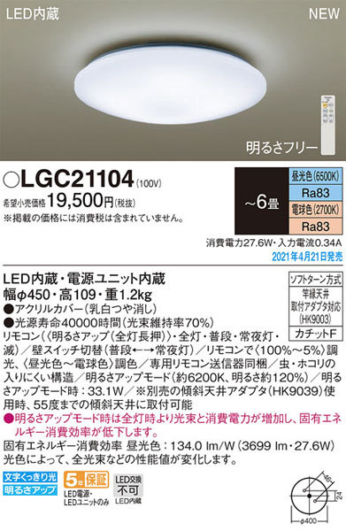 パナソニック「LGC21104」LEDシーリングライト(〜6畳用)【昼光色/電球色/調光調色】LED照明