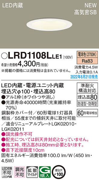 ●型番:LRD1108LLE1●品名:ダウンライト●メーカー:パナソニック●部材:照明器具●器具分類1:ダウンライト●メーカー器具名称:エクステリアダウンライト●総W数:4.5●寸法:埋込穴φ100・埋込高80●本体材質・仕上・色:アルミ枠(ホワイトつや消し)●ランプ種類:発光ダイオード(LED)●:カテゴリ1:/ダウンライト