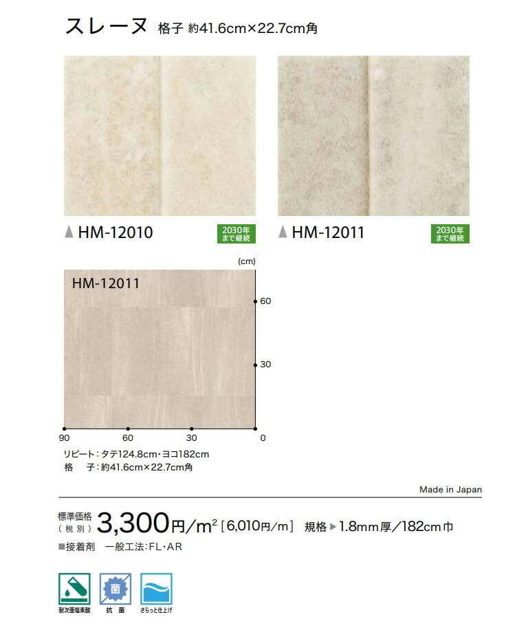 クッションフロア サンゲツ ホームフロア スレーヌ HM-12010〜12011 1.8mm厚/182cm巾 耐次亜塩素酸 抗菌 さらっと仕上げ