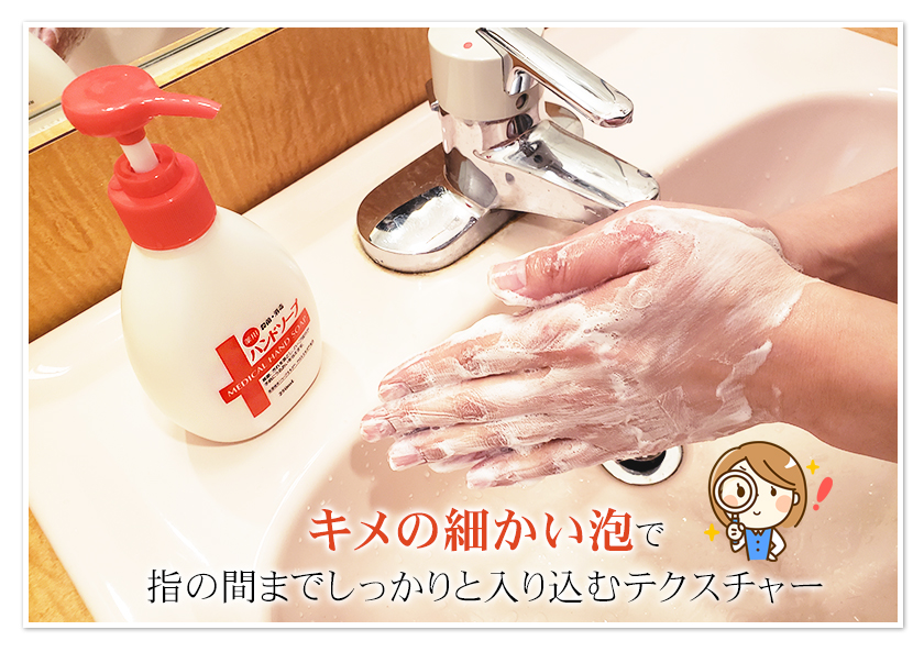 「殺菌&消毒」パワーを最大限に活かせるようキメの細かい泡ができ、指の間までしっかりと入り込むテクスチャーになっています。また肌への刺激もほとんどなく、