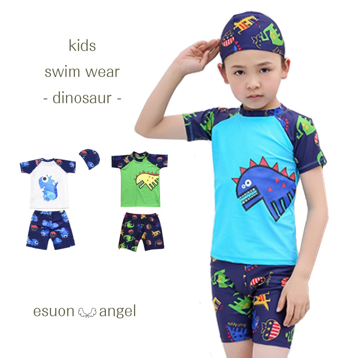キッズ 水着 男の子 上下 3点セット きょうりゅう柄 子供 ジュニア 半袖ラッシュガード ショートパンツ スイムキャップ付き 帽子 セパレート 日焼け防止 紫外線対策 恐竜