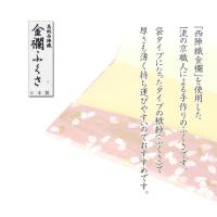 | 商品説明 | 御祝儀はふくさに包むのが礼儀ですが、なかなか上手に包めないもの。金封ふくさがあれば、御祝儀をスマートに差し出すことができます。こちらの金封袱紗は取り出しやすいように袋タイプになったタイプの袱紗(ふくさ)で厚さも薄く持ち運びやすいのでおすすめです。 サイズ:たて約12cm×よこ約20cm×厚さ約0.5cm 素材:「表地」西陣織金襴、「裏地」合成繊維。 日本製(京都) |