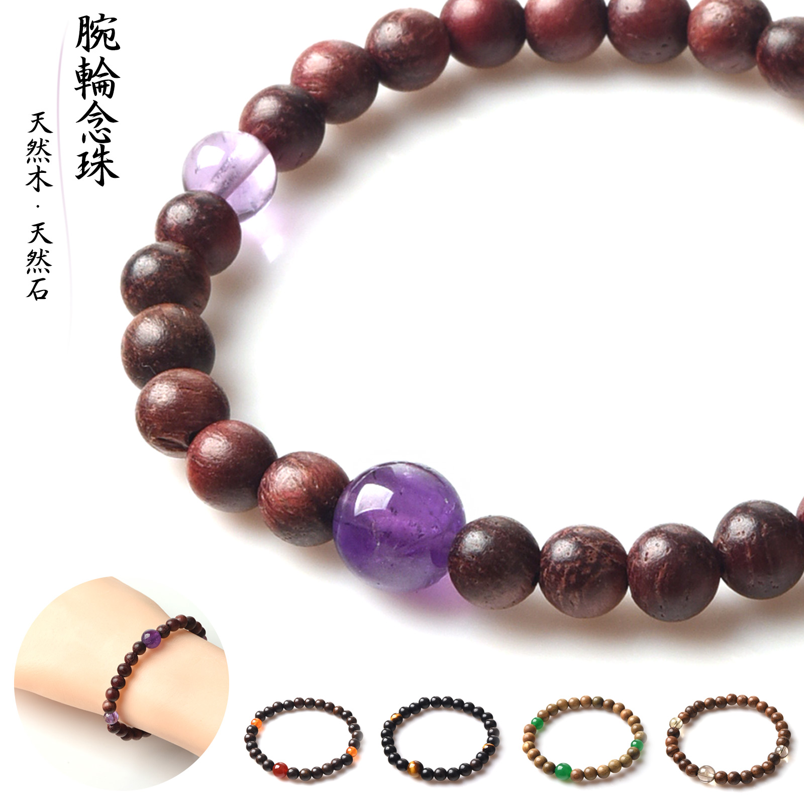腕輪念珠 数珠 ブレスレット 6mm パワーストーン 念珠 じゅず お守り 御守 天然石 天然木 紫水晶 赤メノウ 印度翡翠 虎目石 茶水晶 紫檀 朱檀 緑檀 黒檀 pws
