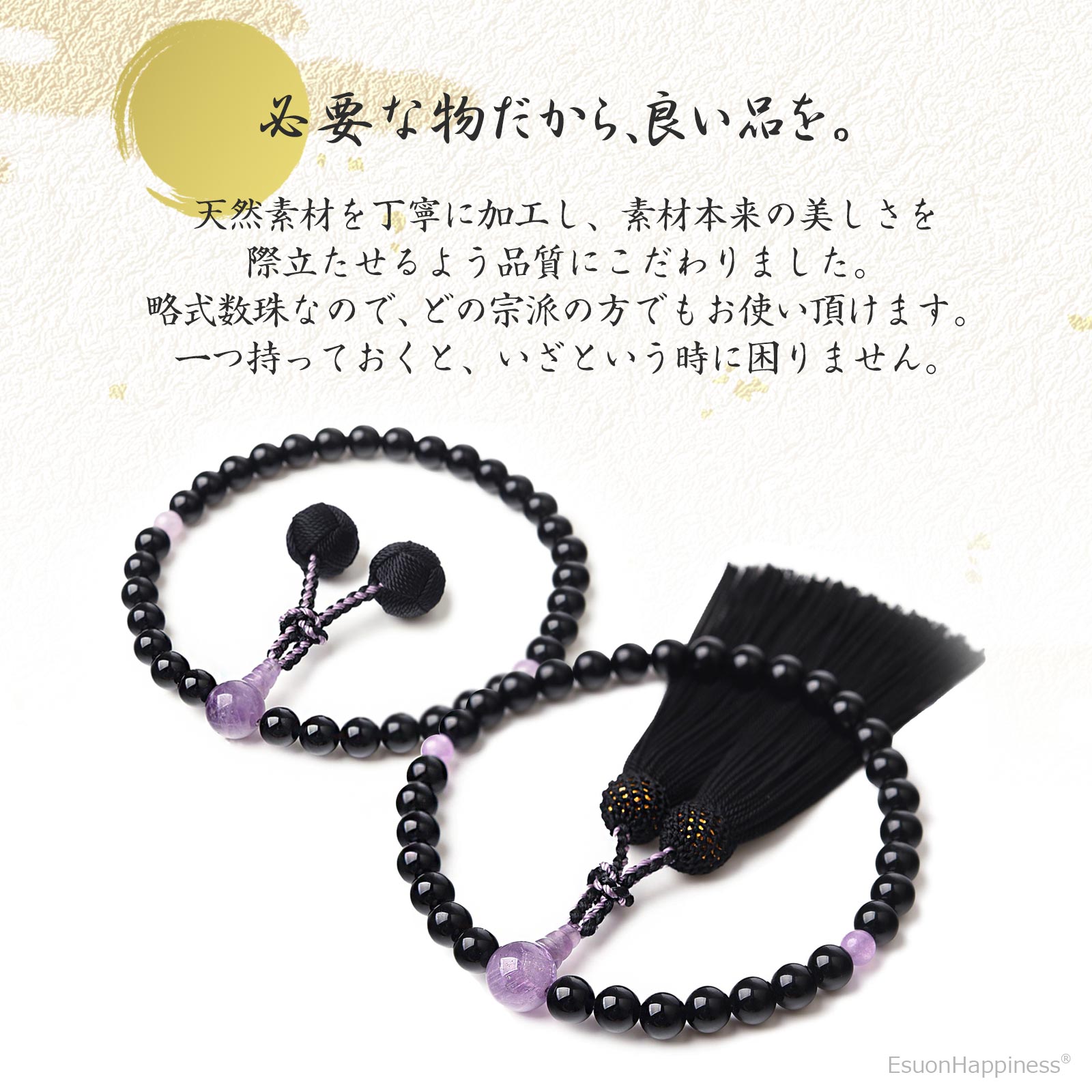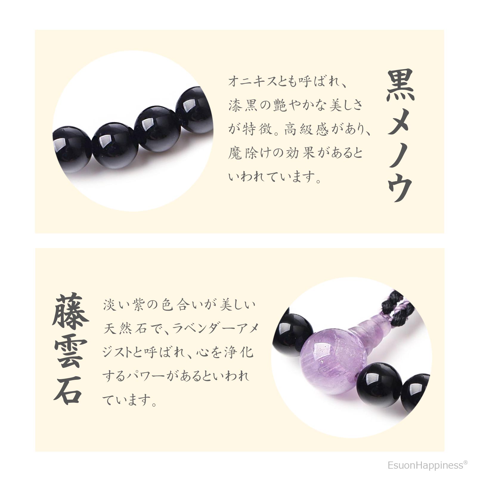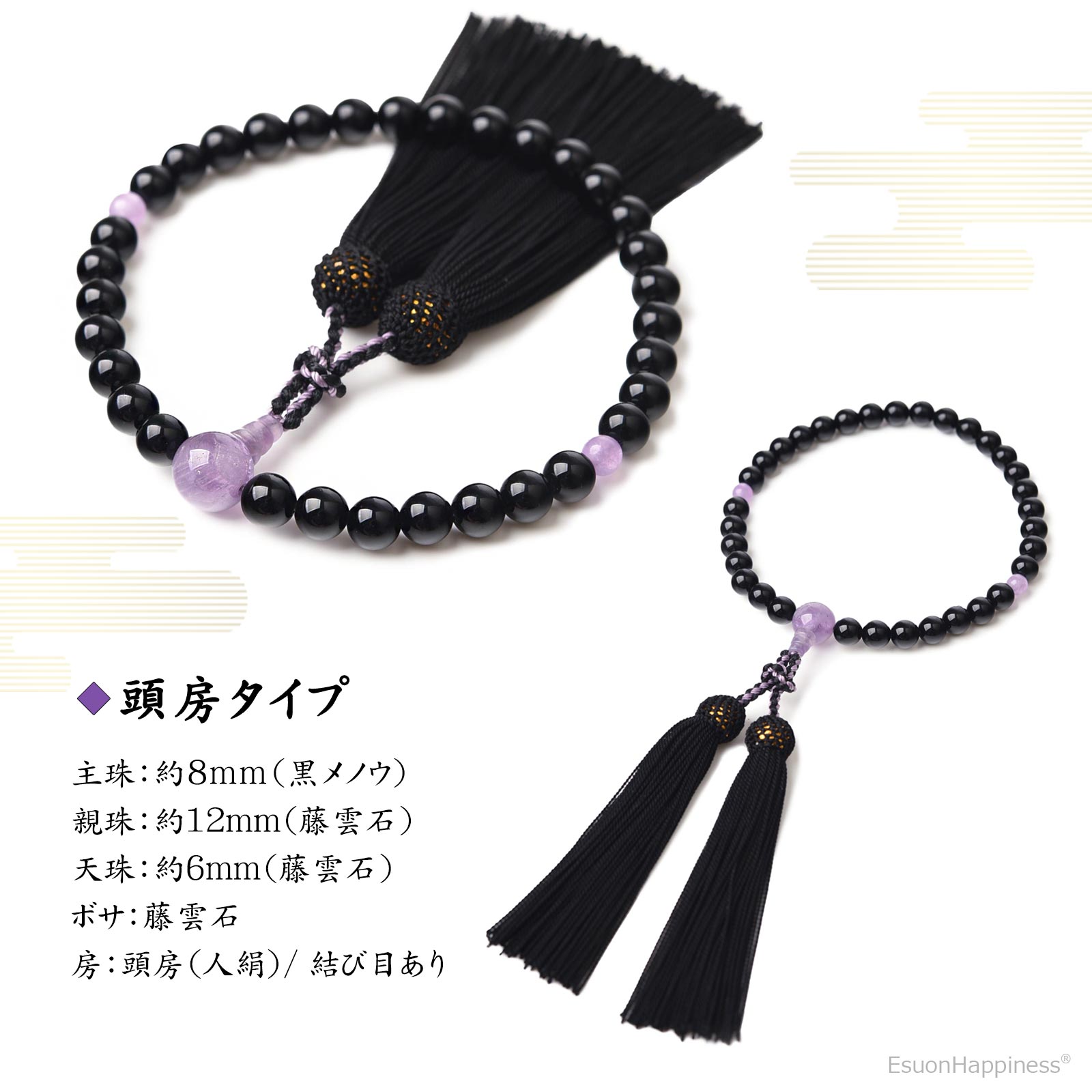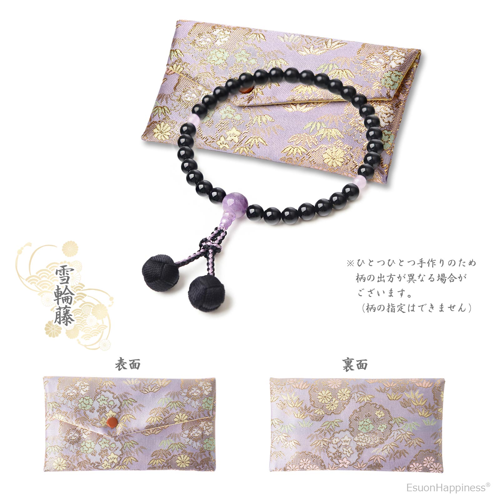 数珠 女性用 黒メノウ 藤雲石 選べる 房 8mm 西陣織金襴 数珠入れ 付き オニキス 略式 頭房 梵天房 宗派共通 数珠入れ 念珠 天然石