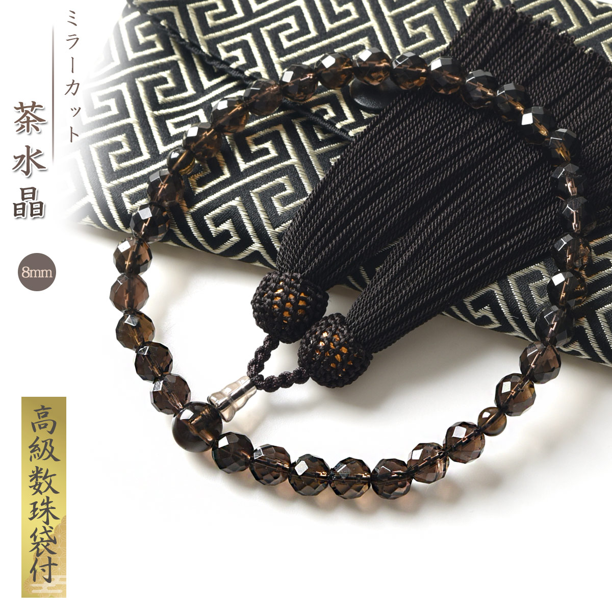 数珠 女性 女性用 茶水晶ミラーカット 8mm 高級 数珠入れ 付 スモーキークォーツ 念珠 天然石
