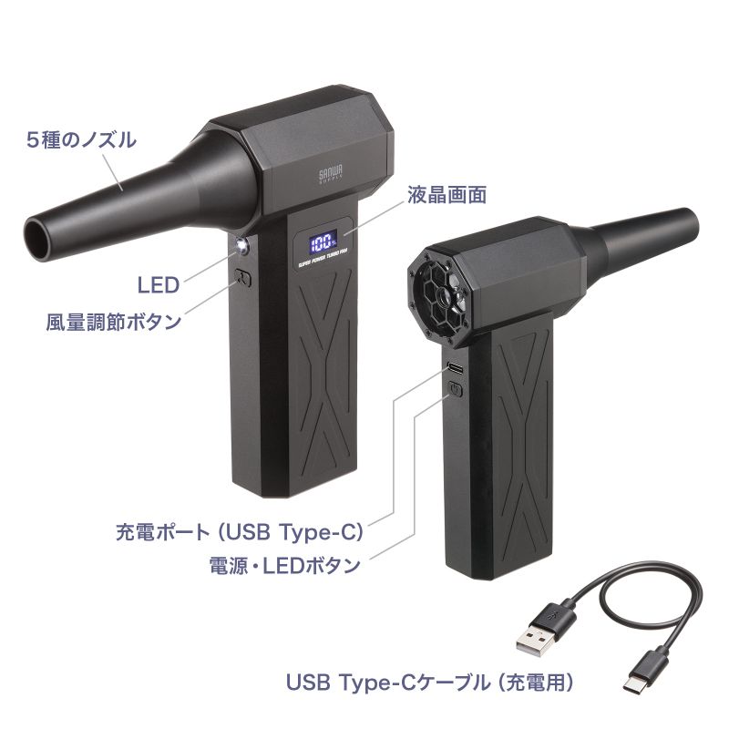 電動エアダスター 充電式 コンパクト 小型 風速31m/s 風量4段階調節 ノズル5種類付属 液晶画面付き ガス不使用 LED 逆さ噴射可能 クリーナー