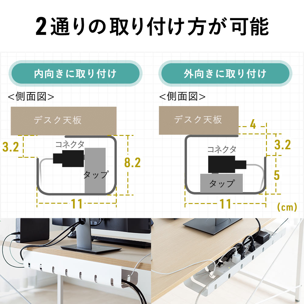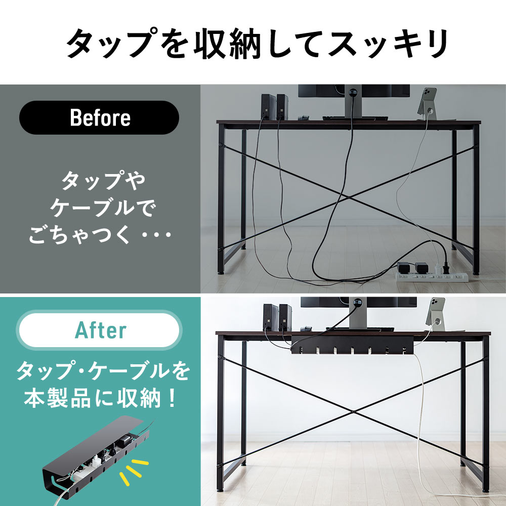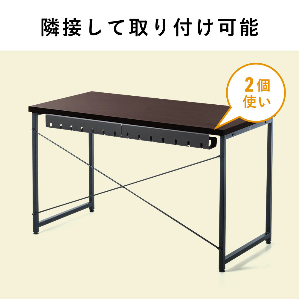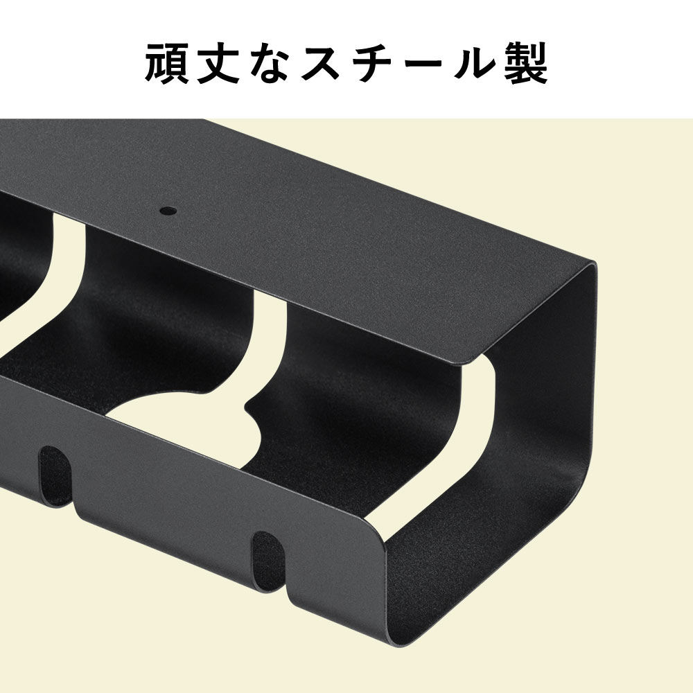 天板裏に取り付けて、電源タップとケーブルを一緒に収納できるケーブルトレーです。シンプルな見た目でごちゃつくケーブルの配線を目隠しできます。