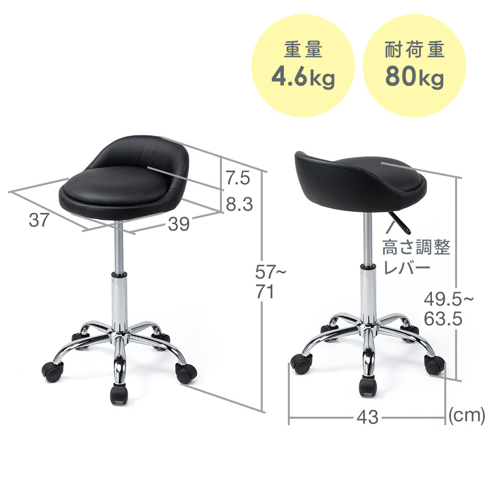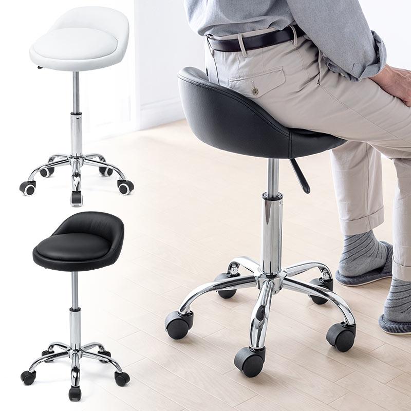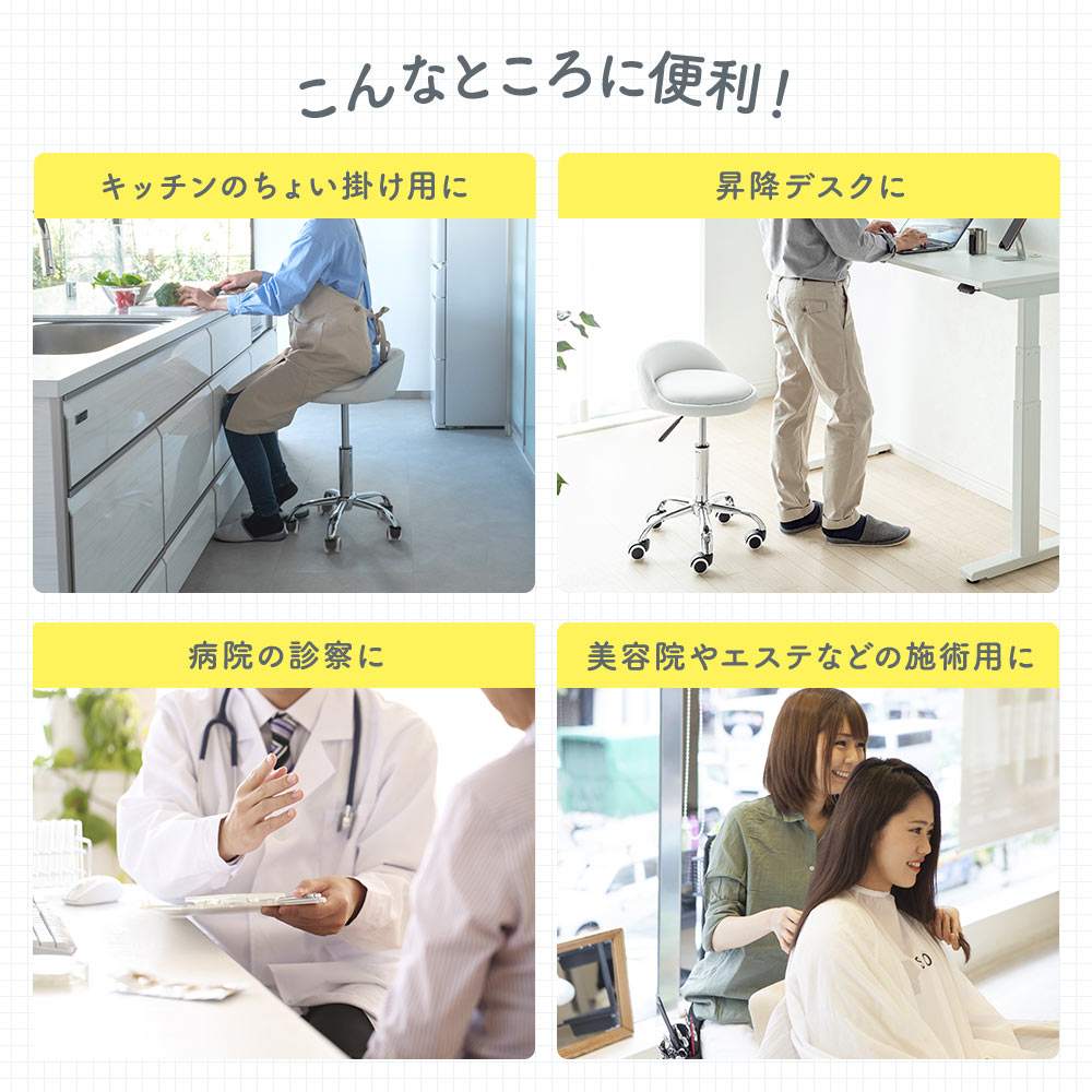 様々な場所で使用できるシンプルでおしゃれな、背もたれ付き丸椅子です。キャスター付きで移動も簡単にできます。座面は高さ調節可能です。色はブラックとホワイトの2色です。