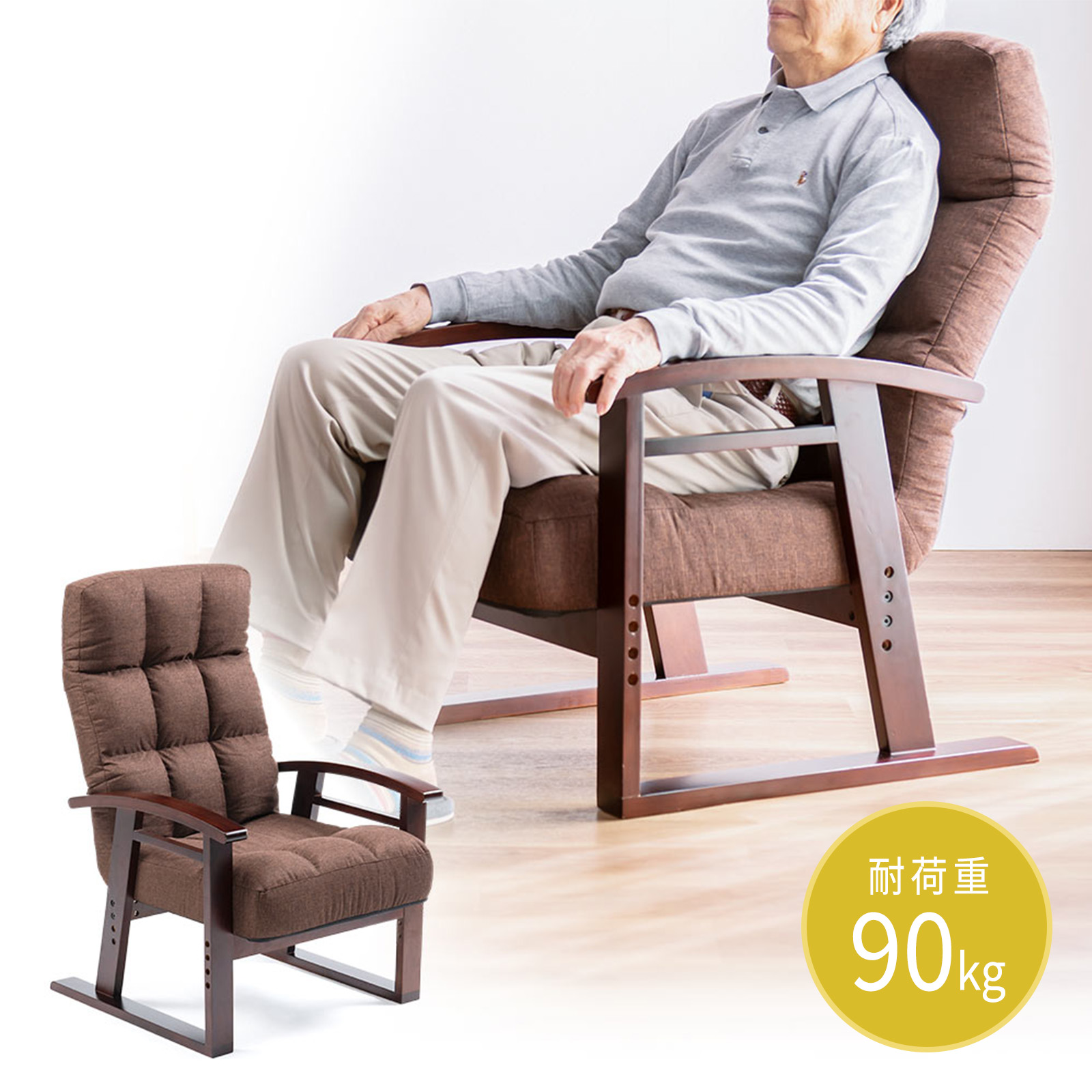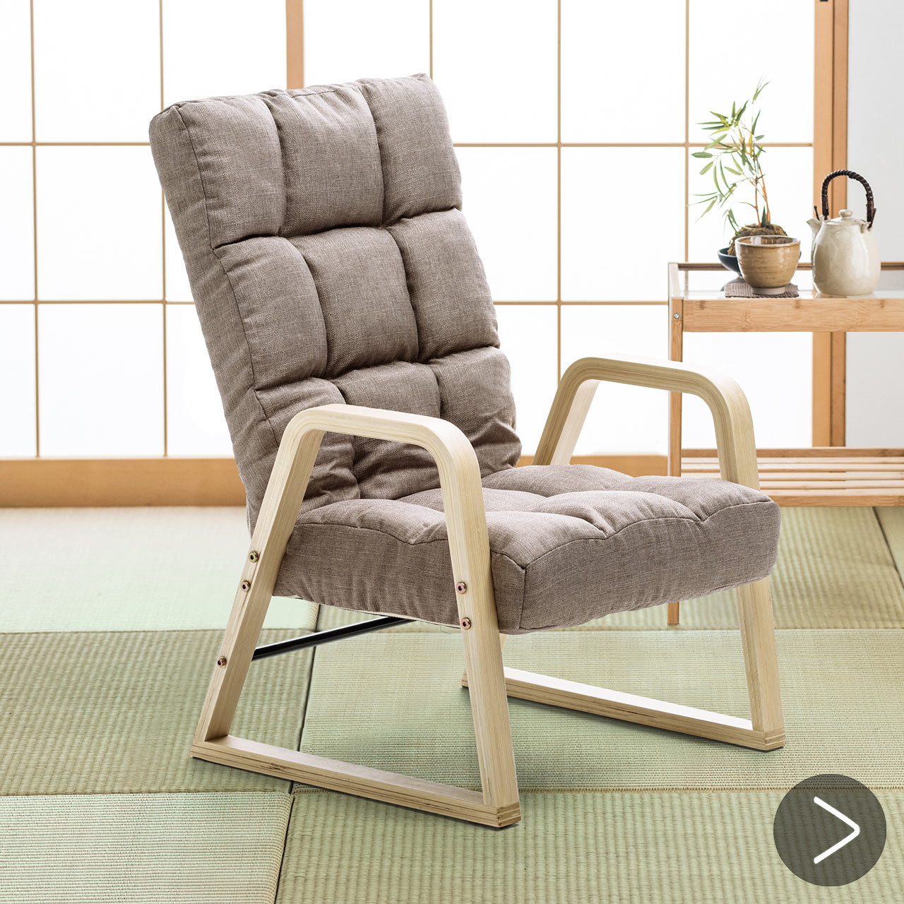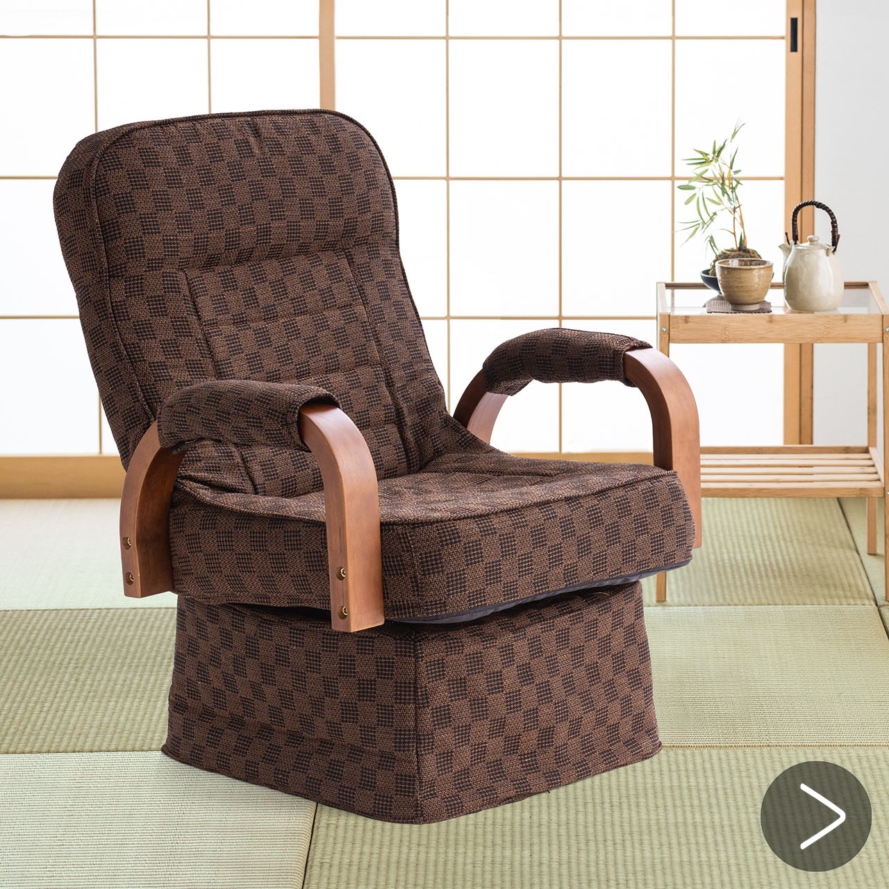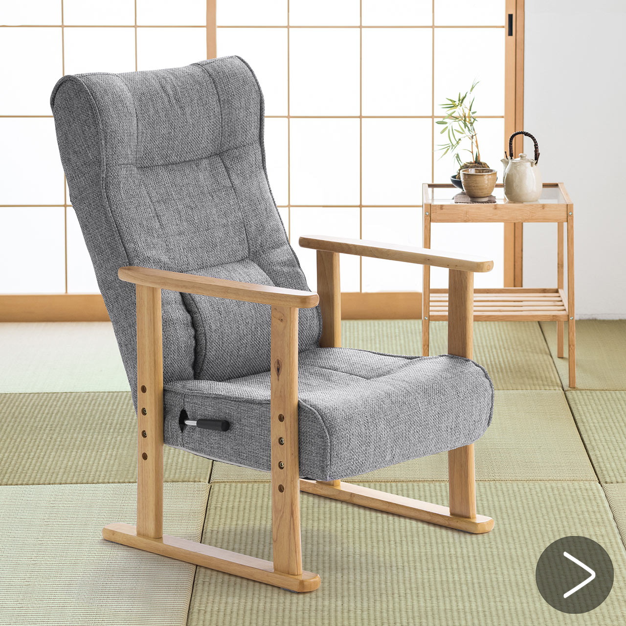 ●肘掛け付きで、足腰に不安がある人でも立ち座りしやすい高座椅子です。