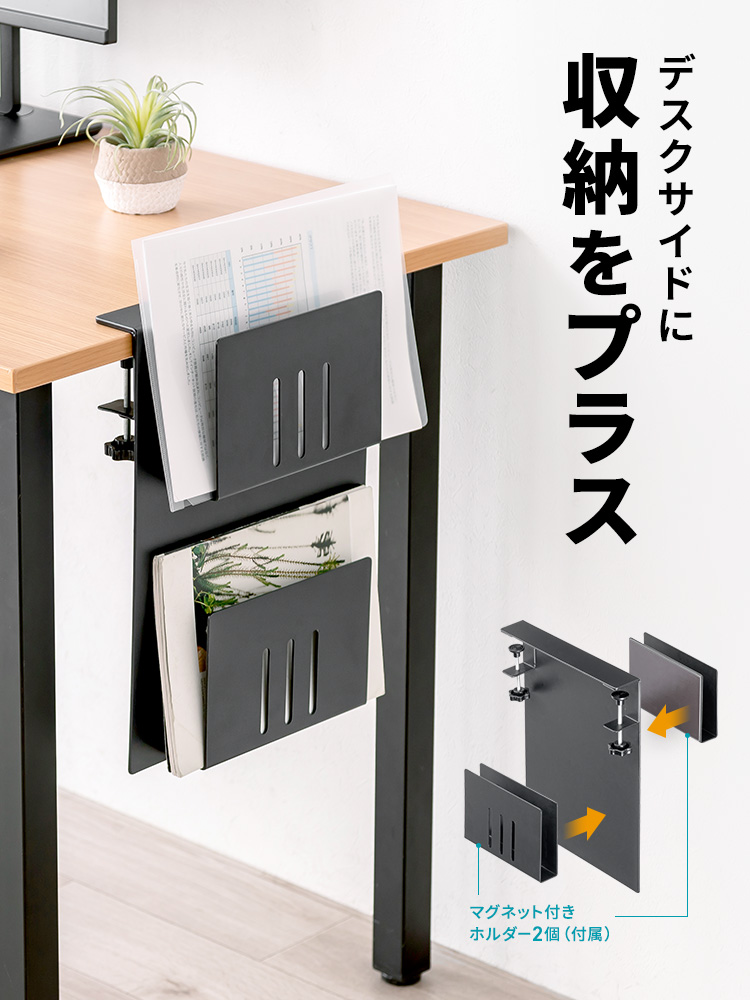 ●マグネットでホルダーを任意の場所に貼り付けできる、デスクサイド収納です。