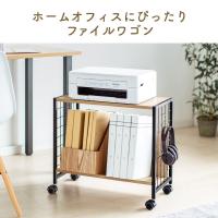 背表紙が見やすく、A4ファイルなどが取りやすい斜め棚でデスク下のスペースを有効活用できるファイルワゴンです。ナチュラルな木目調の天板とアイアンフレームの組み合わせがおしゃれです。天板にはプリンターや小物を置いておけます。