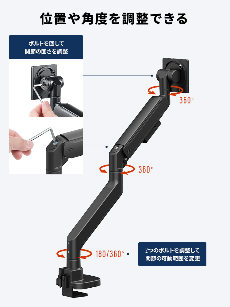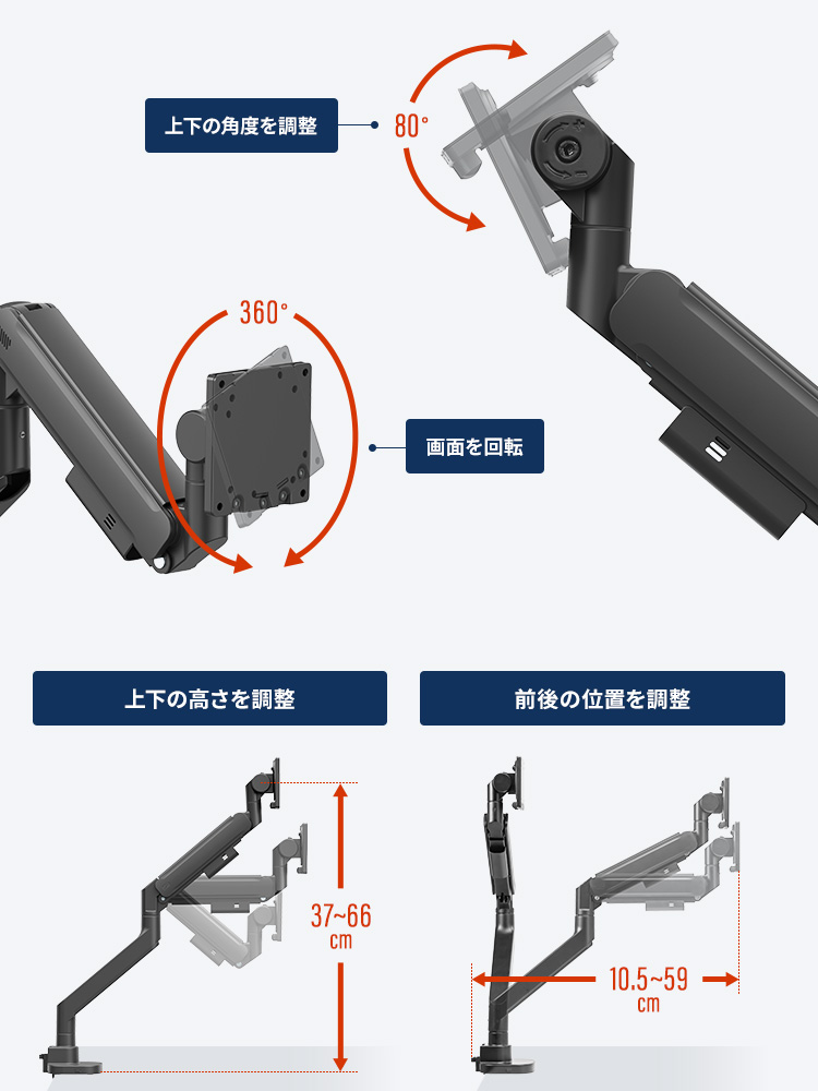 ■可動範囲:画面上下(チルト)/上下80°、画面左右(パン)/180°、画面回転(ローテーション)/360°