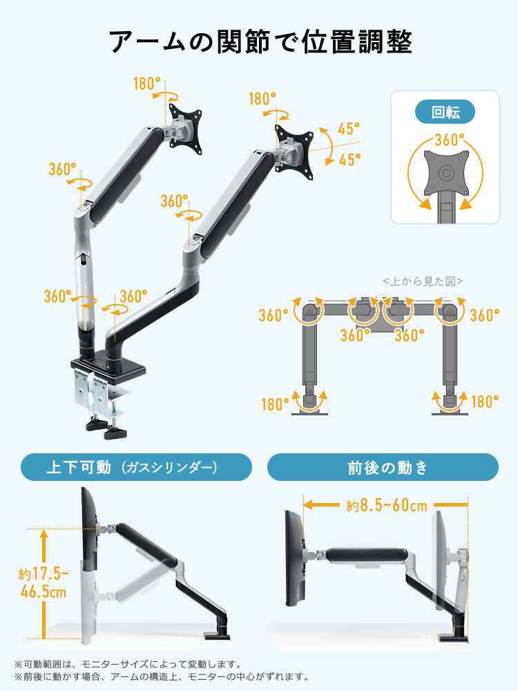 ●アームは3関節あり、上下・左右・前後の位置・角度の調整が可能です。