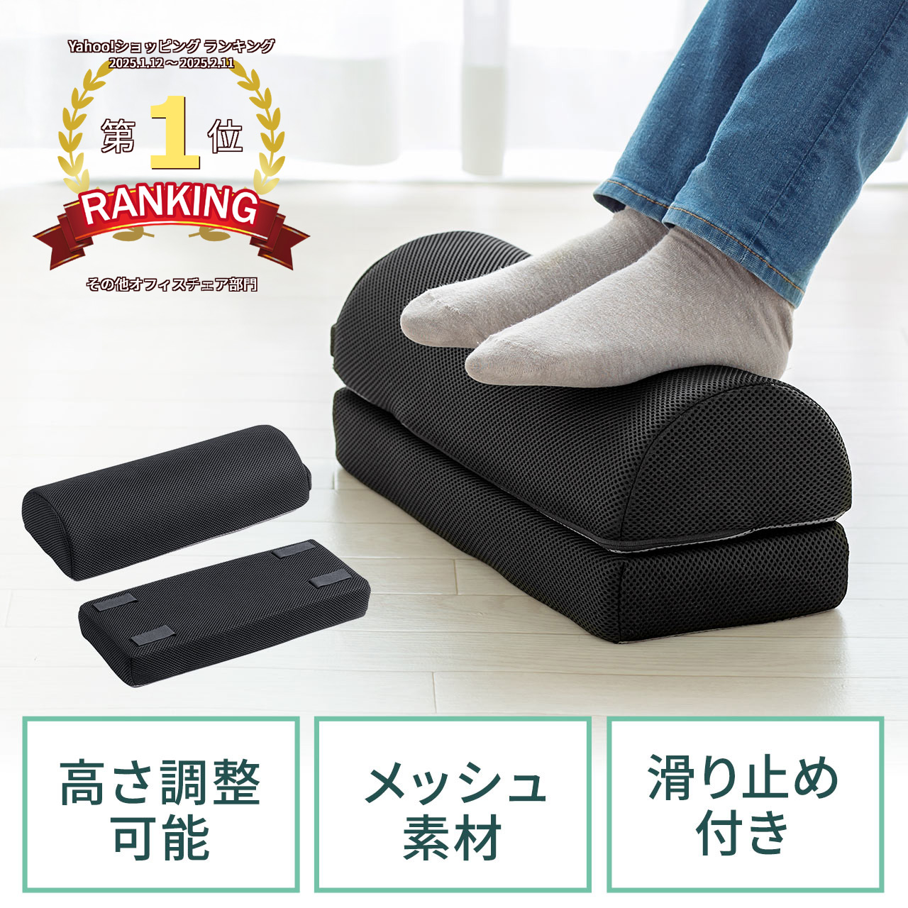 足元のクッションとして使用できる足置き台。低反発クッションを採用しじんわり沈み、ムレにくいメッシュ素材を使用しています。オフィスても家庭でも使用でき、肘置き台や足枕、ゲーム用の肘置きとしても使えるマルチクッション。上下分割して使用も可能。