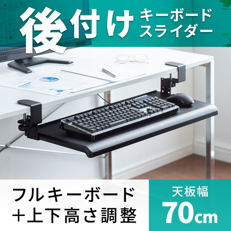 デスクに後付設置できるキーボードスライダー。クランプ式でネジ不要の簡単設置。デスクをキーボードトレー付きにできる後付スライダー。高さを4段階で変更可能。幅70cmでフルキーボードの設置にも最適。拡張デスク・天板。エルゴノミクスデザイン。