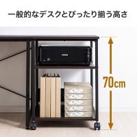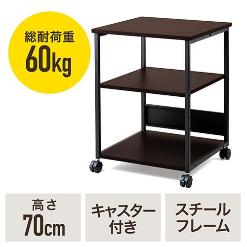 インクジェット複合機やレーザープリンタの設置に最適なプリンタ台。天板は木目調で、リビングや書斎、オフィスなど様々なシーンで使える。一般的なデスクと同じ高さ70cmで、デスク横にキレイに並べられる。キャスター付きでちょっとした移動時に便利。5段階で位置が調整できる中棚付きの3段タイプ。総耐荷重60kg。茶色。