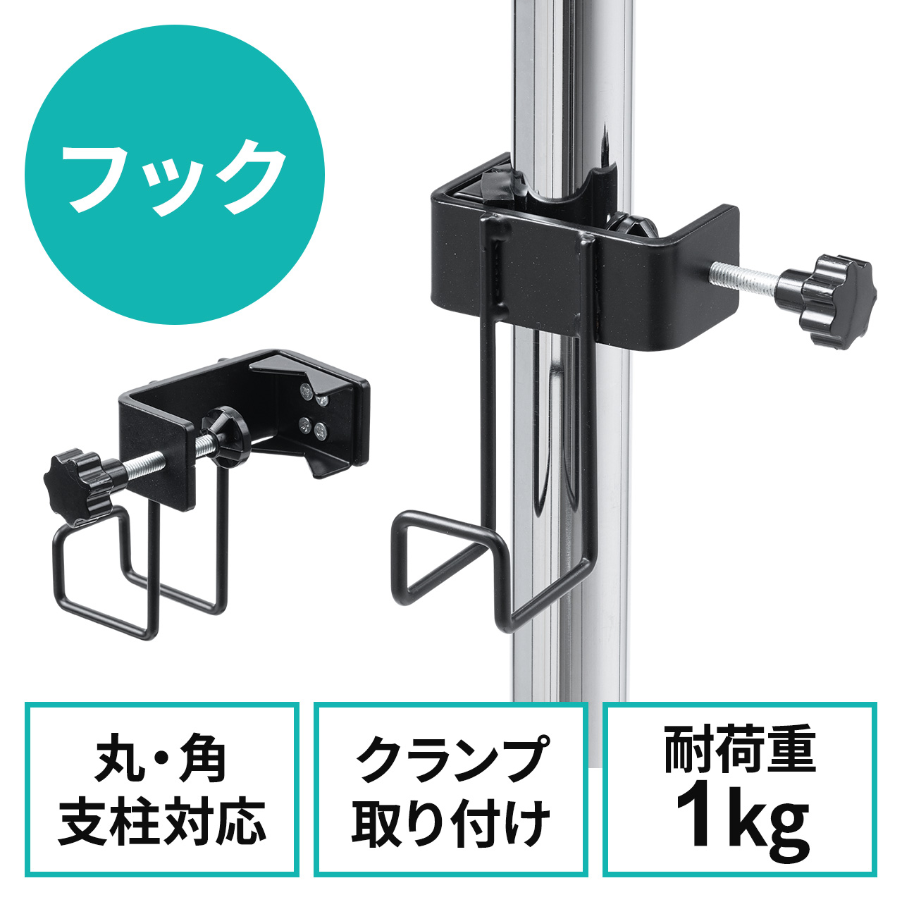 ●支柱やフレームに取り付けできるクランプ式フックです。