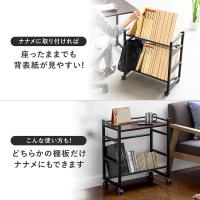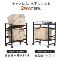 A4収納が可能で、キャスター付のファイルワゴン。2段の棚板は、水平にも斜め棚にもできる2WAY仕様。デスク下カートとして使用でき、プリンター台、押入れ収納用台、キッチンなどでも使用できるシンプルデザイン。木製。