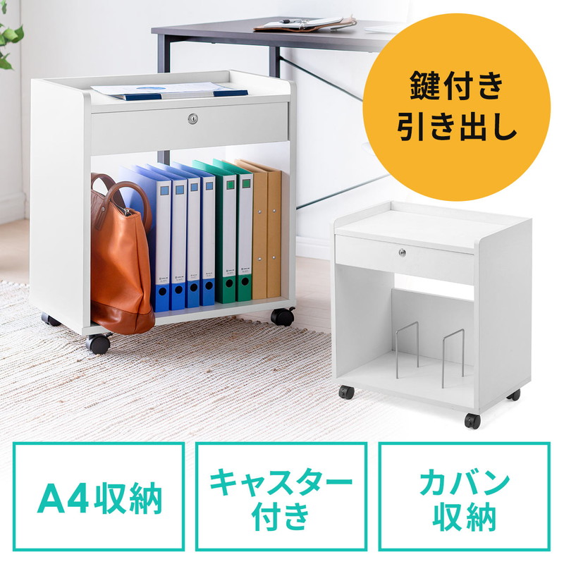 デスク下に収納しやすい高さ60cmで、A4収納ができるファイルワゴン。キャスター付きで移動もしやすく、鍵付きの引き出し付きで、ペンなどの文房具や貴重品なども収納可能。ホワイトカラーでオフィスや在宅でも使いやすいシンプルカラーのファイルワゴン。